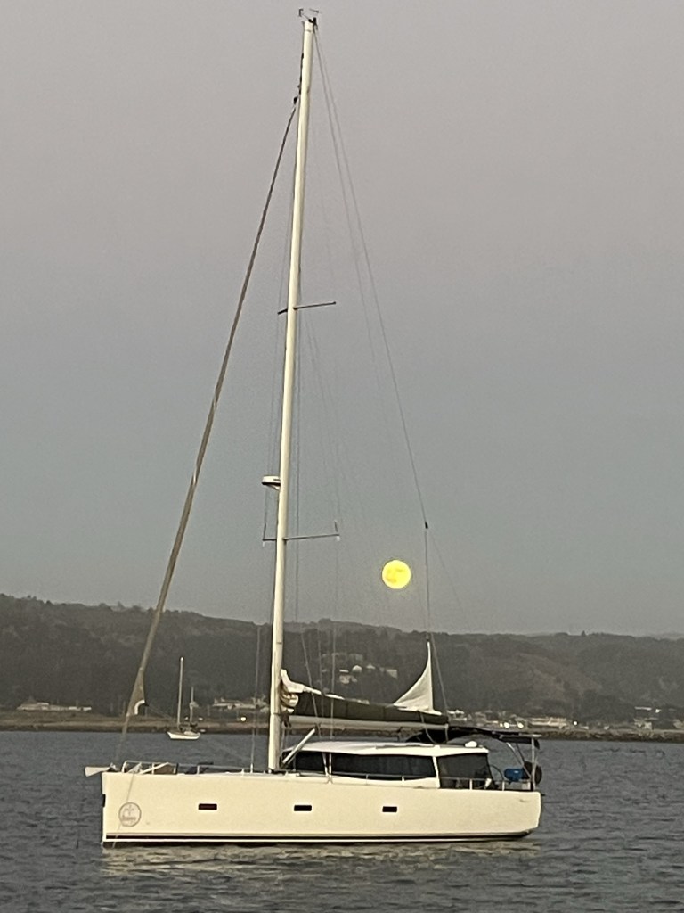 Ironically, the moon was full during our stay at HMB and we got a beautiful photo of our neighbor’s boat, Happy. It gave us an excuse to connect with Hugh and Lynn, Happy’s owners, the next day.