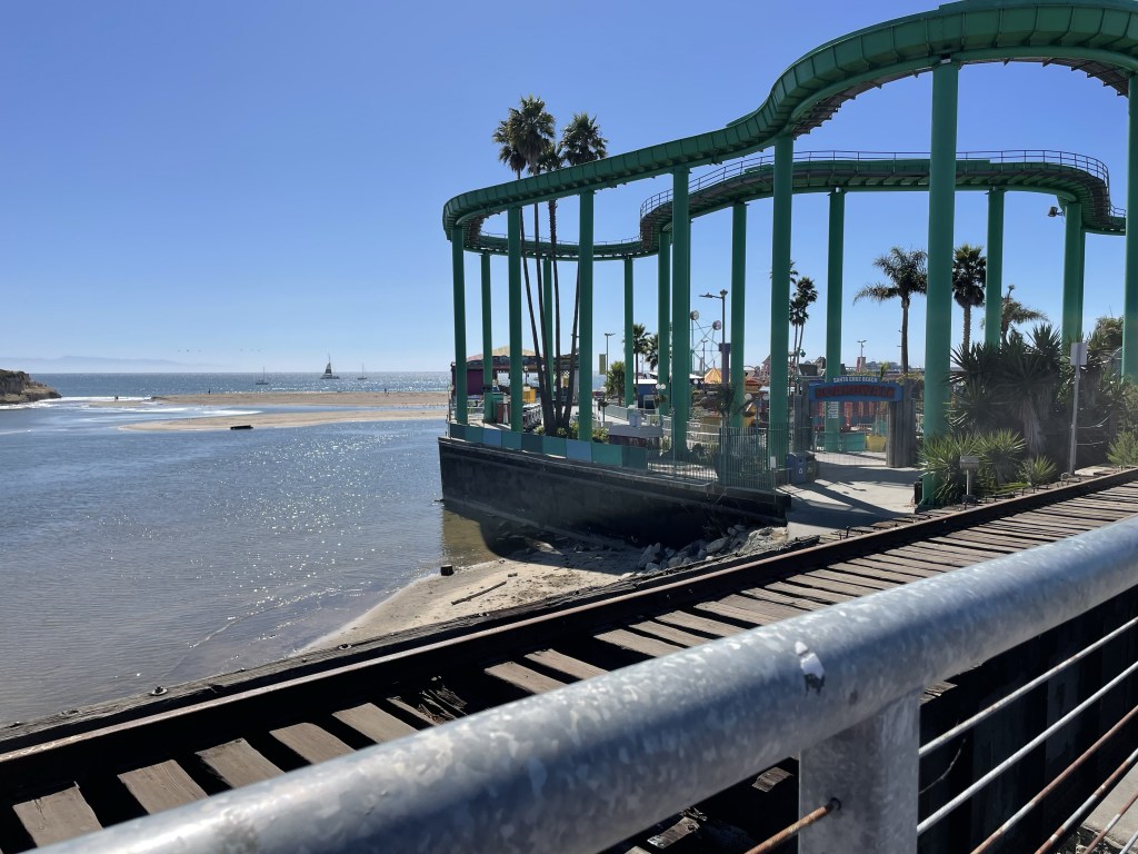 We also took the opportunity take a walk to the Santa Cruz boardwalk while waiting for our laundry to process. My (Meredith’s) family spent some summer vacations, and I have fond memories of time on the boardwalk and roller coaster rides on the Giant Dipper. The boardwalk is now only open on weekends during the offseason, so we had to view it from afar.