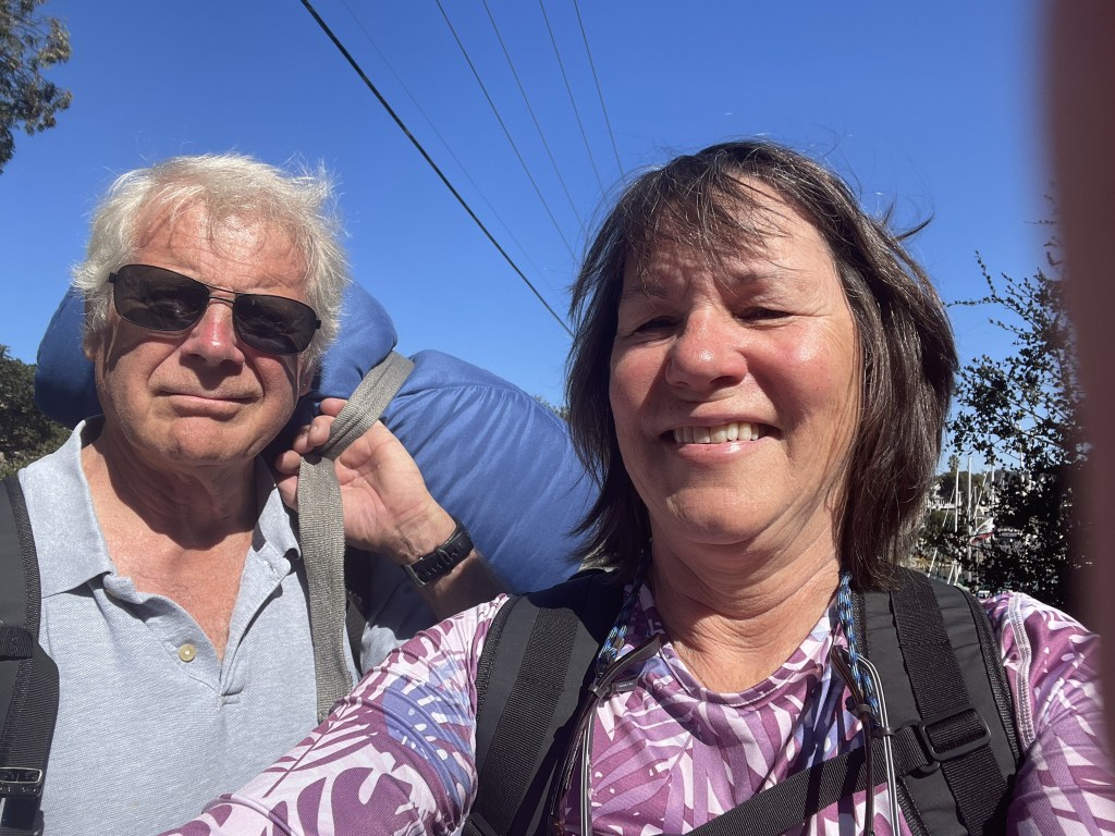 We enjoyed our walk back with our laundry in backpacks and a bedroll in Herman’s arms, which might have made us look homeless. We wrapped up our activities in Santa Cruz with “Taco Tuesday” at the Santa Cruz Yacht Club. Some of our biggest pleasures are the wonderful people we’re meeting along the way.
