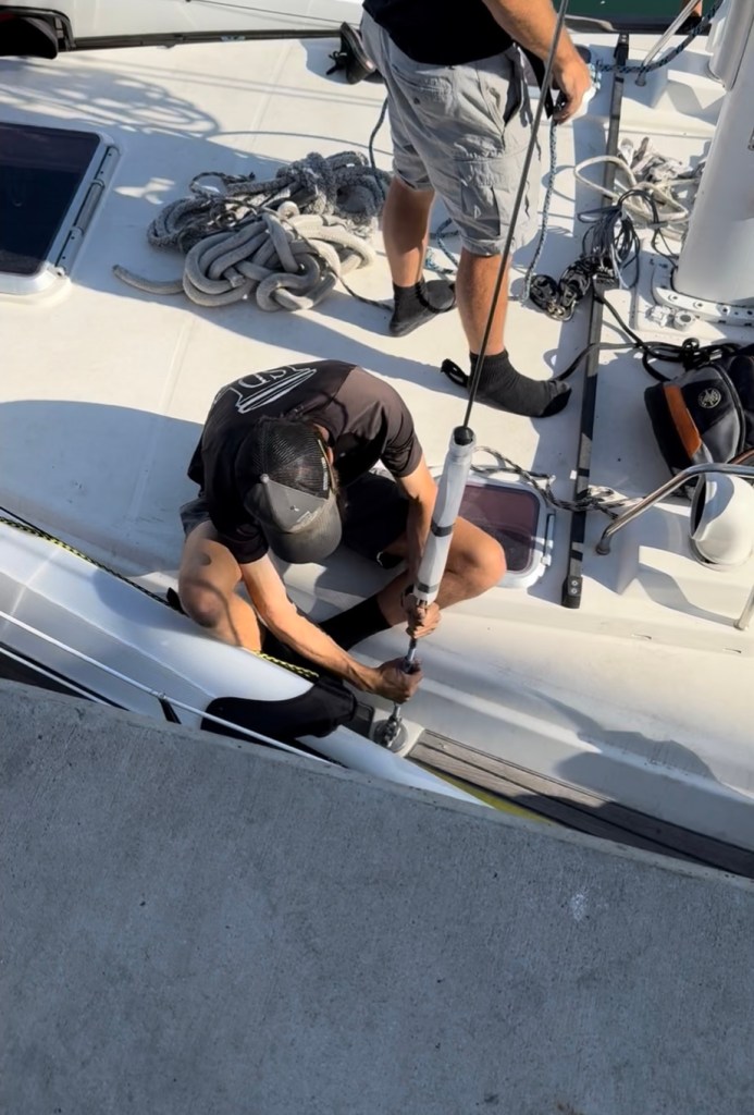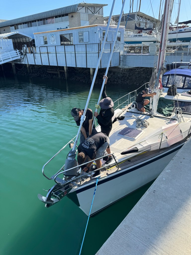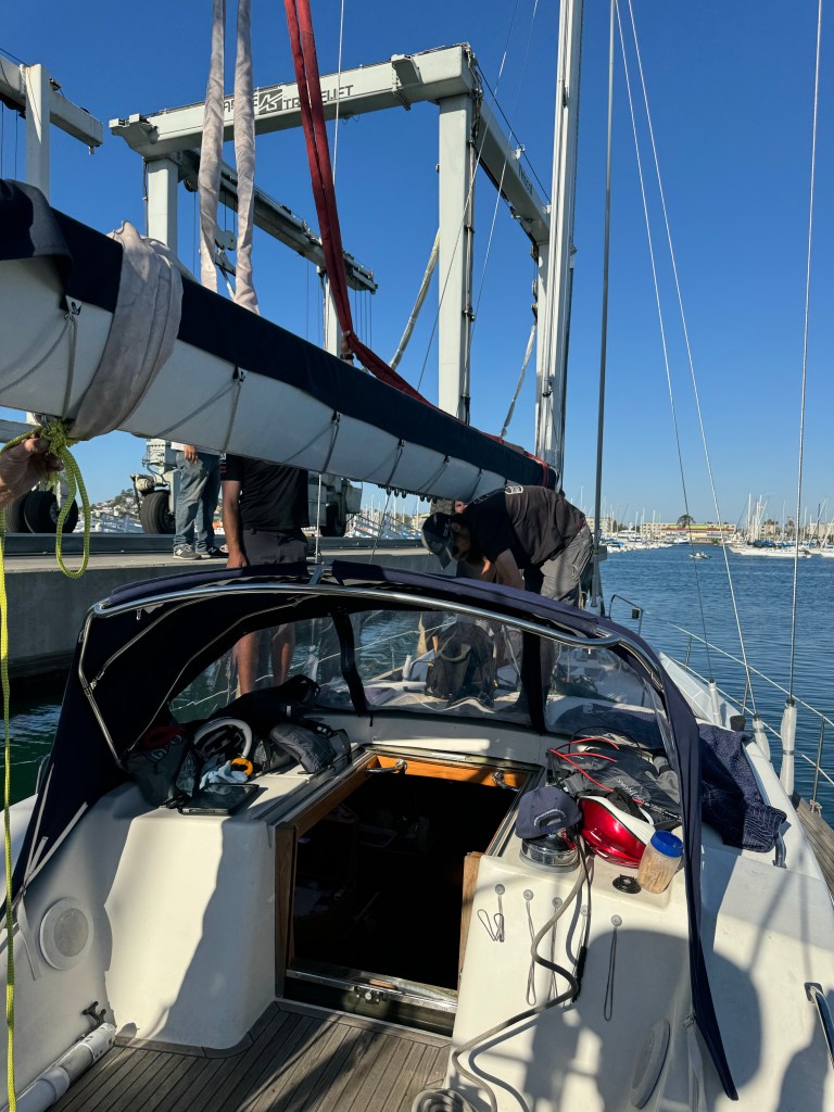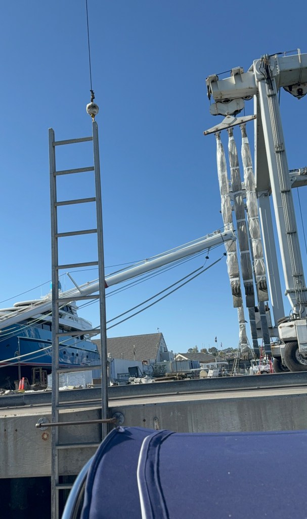 The rigging re-installation was fun to watch. Tieton has a mast that is about 62 feet above the waterline, with a furling boom that wraps the main sail inside the boom when not in use. The furling genoa and jib (forward sails) go from the bow to the mast, and the back stays stabilize the mast from the stern (back). The shrouds are on each side of the mast and stabilize the mast side to side. All these components and the stays/shrouds that fasten them to the boat were replaced with new and reattached during the process. The SD Rigging team worked so well together, it was almost like watching a ballet. Here’s a link to the crane lifting the mast.