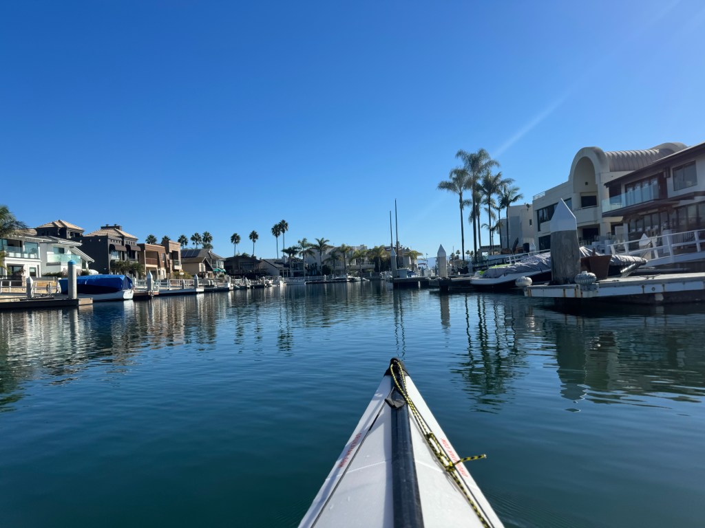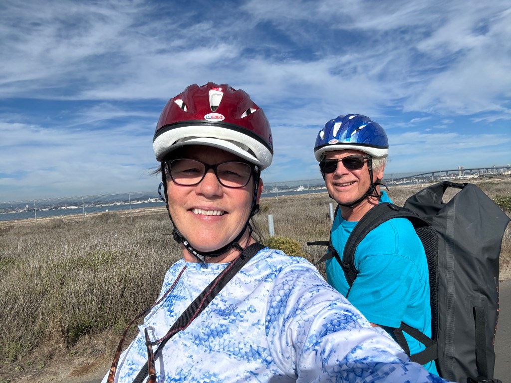 A cay is a small low-elevation island on the surface of a coral reef. The Coronado Cays is networked with canals that contain multi-million dollar homes with docks in front, many which were empty for our entire stay. Some of YC members we met live aboard their boats and were just great people. We were once again blessed with a visit from our friend Laura Mason during her layover. She hopped the ferry to Coronado, rented a bike and came to the Cays for lunch and a kayak ride, before she headed back for her flight out. The next day, we rode bikes to Coronado for groceries and a quick look at Glorietta Bay (red dot in middle) where we are anchored out tonight.