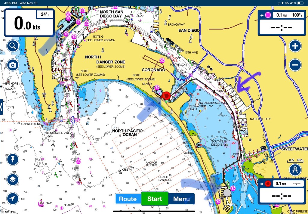 We moved from Silver Gate Yacht Club (upper left arrow) to Coronado Cays Yacht Club (lower right arrow) on Saturday, which was about 10 NM away. The San Diego Bay is large and shallow. The navigation map below shows the variety: white parts of the map are deep (> 15 ft.), light blue are a somewhat shallow (6-15 ft.), darker blue is really shallow (<6 ft.), green is tidal (sometimes above water), and yellow is land. Navigation for boats with a larger draft, such as Tieton at 7 feet, is only possible because of dredging, and the dredging is deep enough to allow cargo ships and aircraft carriers out to the purple arrow.