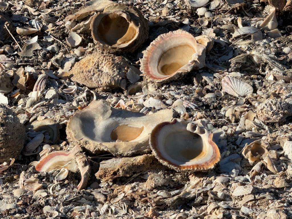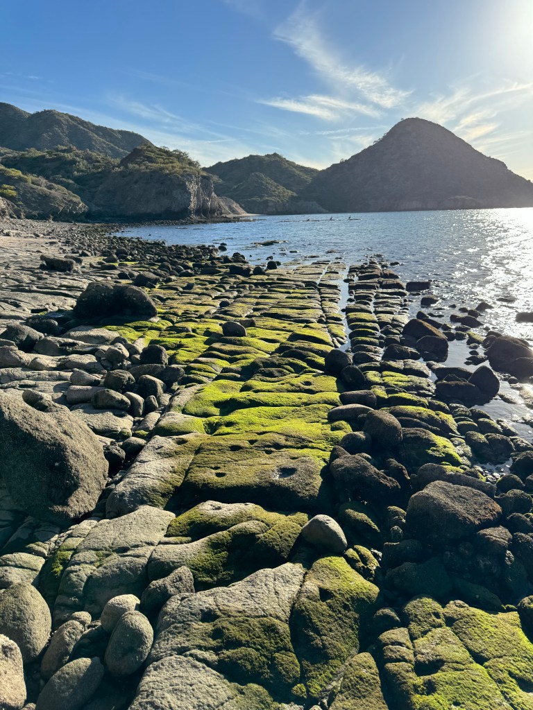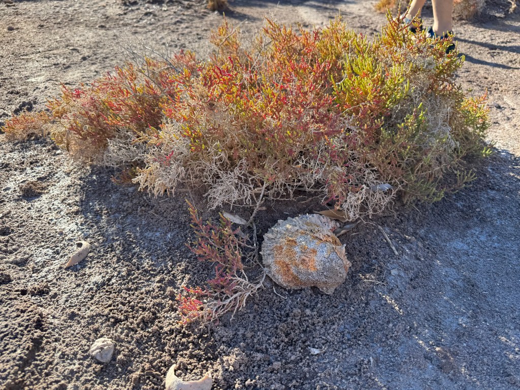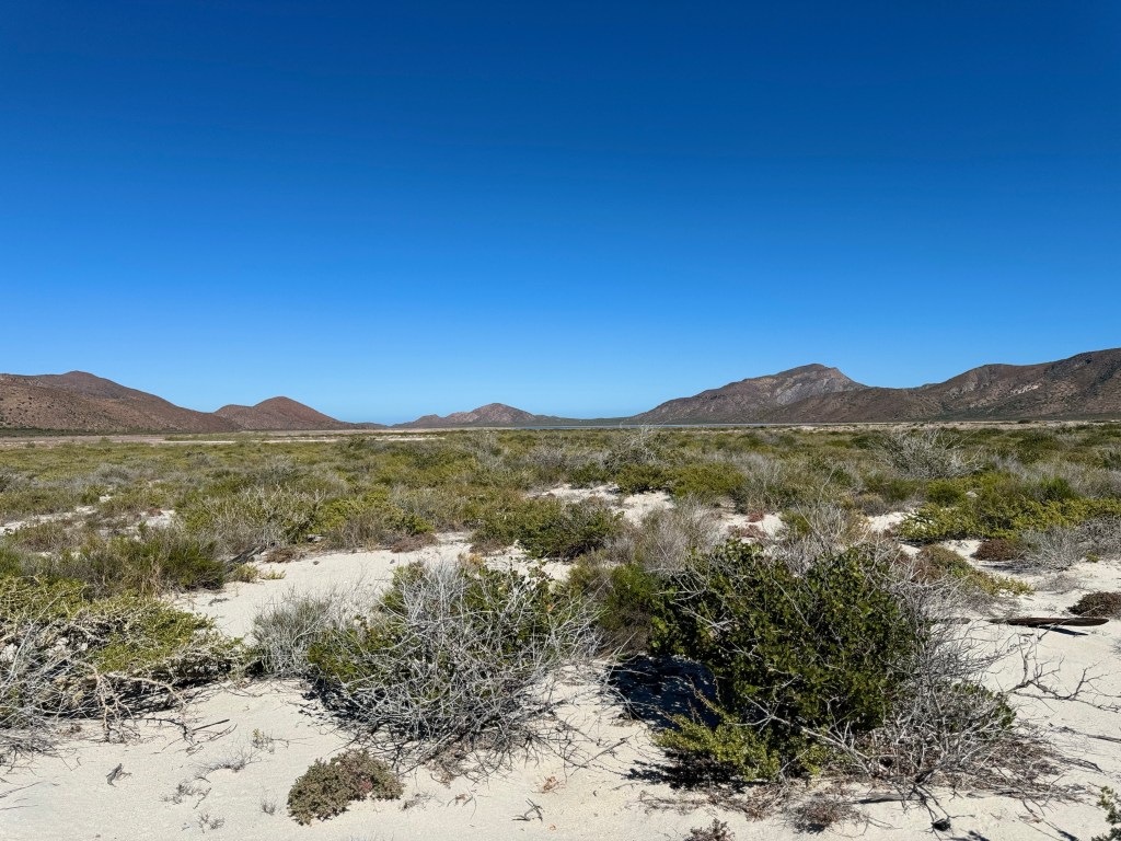 From Puerto Ballandra on the Isla Carmen, the twinkling lights of Loreto are visible in the distance. Ballandro’s mangroves are next to the beach and a wash runs up the valley, eventually connecting to the salt pond in Salinas. Amazingly, seashells are found well into the wash and appear to have been there for decades, or perhaps centuries. Most of the land adjacent to the bay is part of the marine sanctuary, so we were able to walk around. Visitors are encouraged to leave everything and pets aren’t allowed.