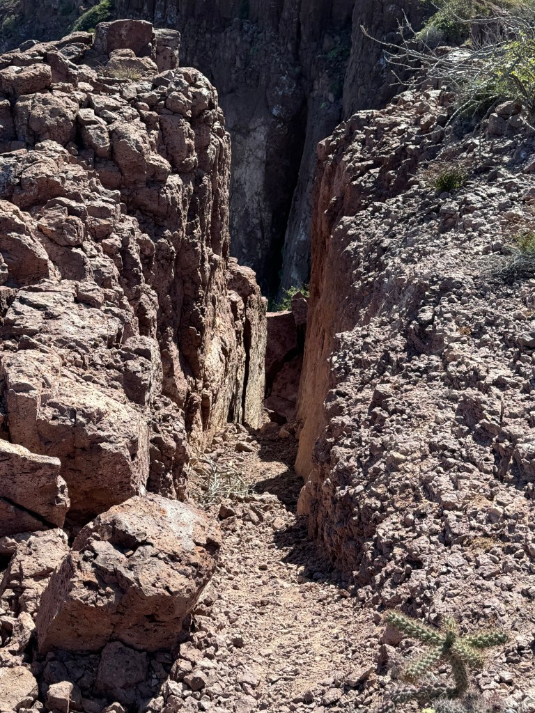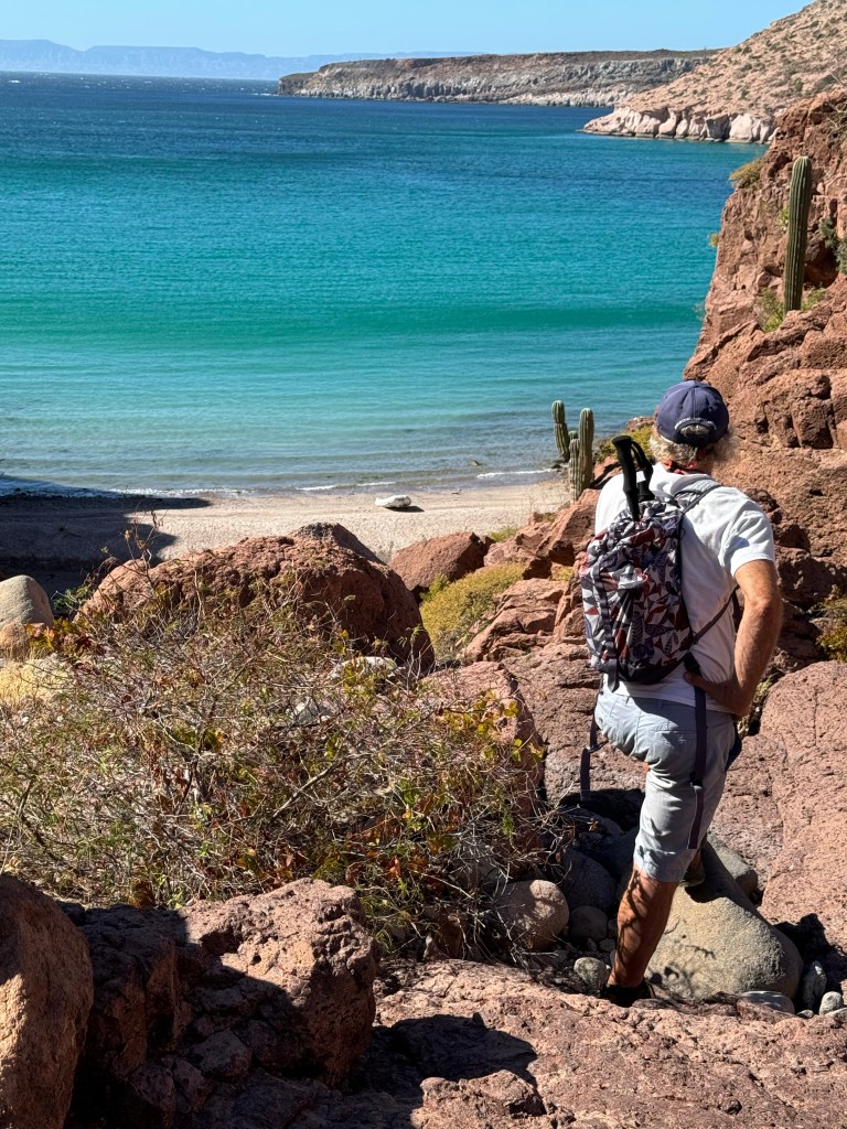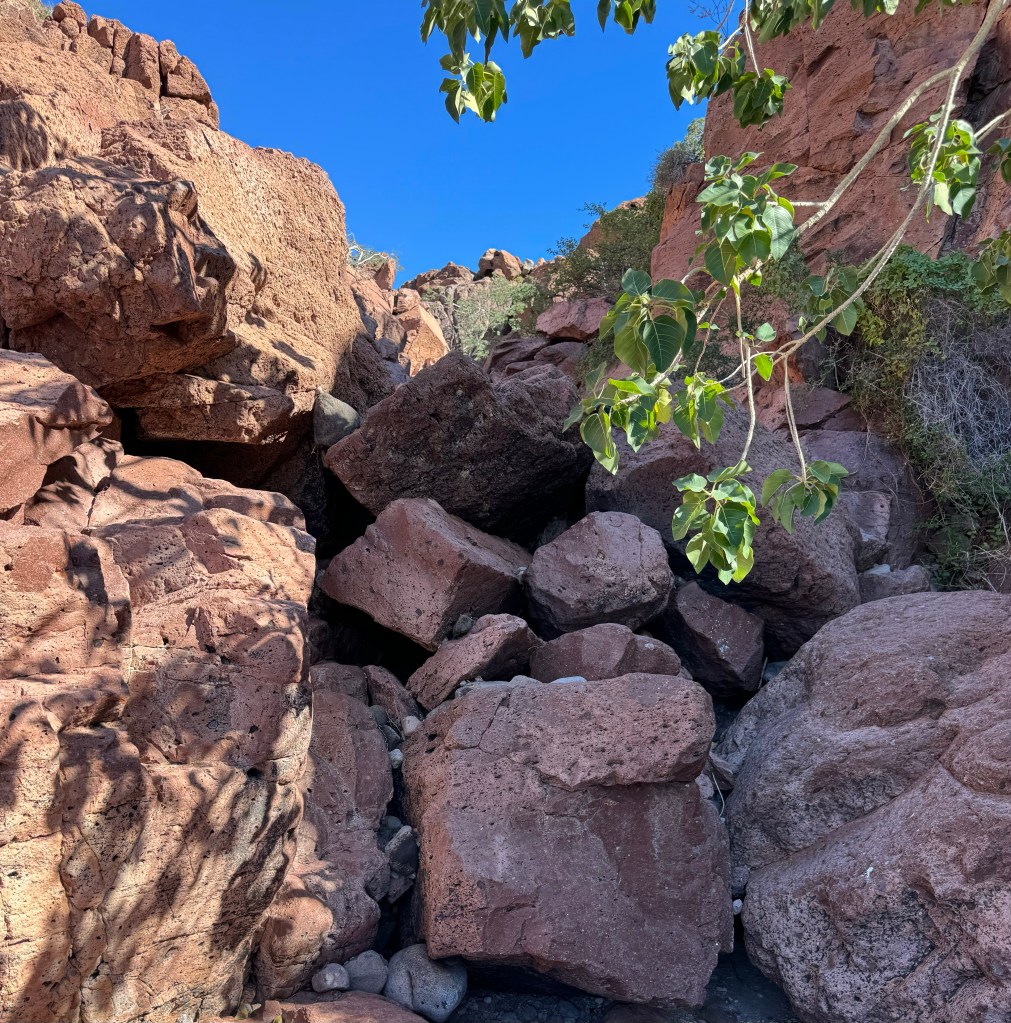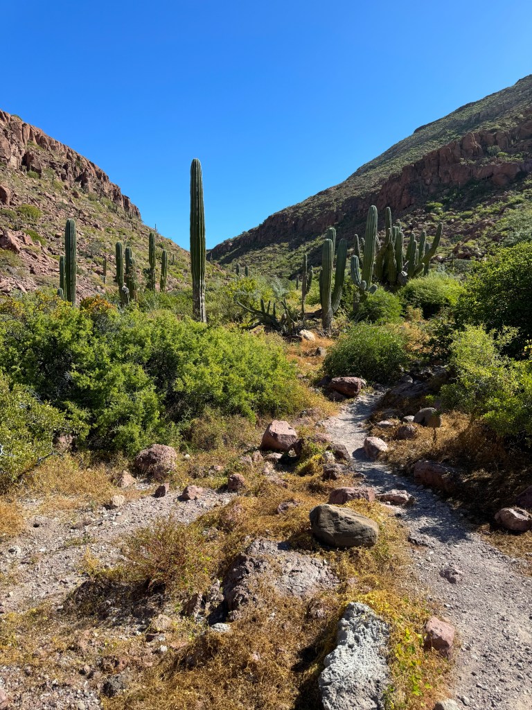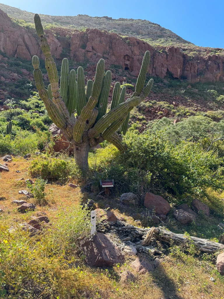 The next day, we explored another beach, which had the first curated hike we’ve taken in Mexico. Instead of just the typical rock cairns that mark trails, this hike had signage for both the hike/bouldering and some of the foliage along the way. After hiking through the steep riverbed, we reached a cliff that overlooked the open Sea of Cortez. The mountains here keep the history of the volcanoes and earthquakes which formed them, including the seashells found at the higher elevations in the riverbeds.