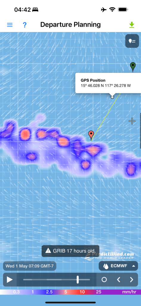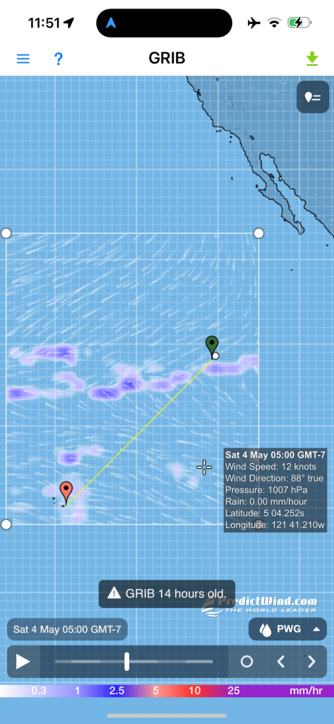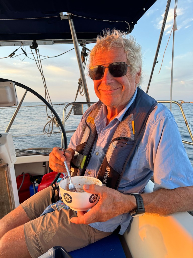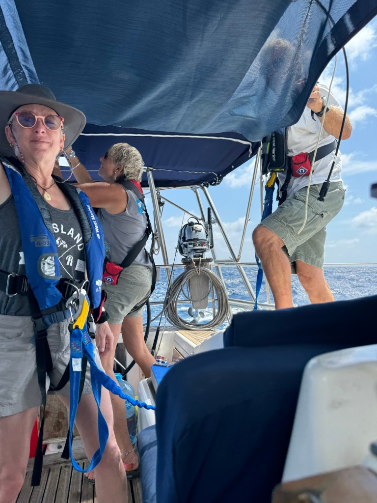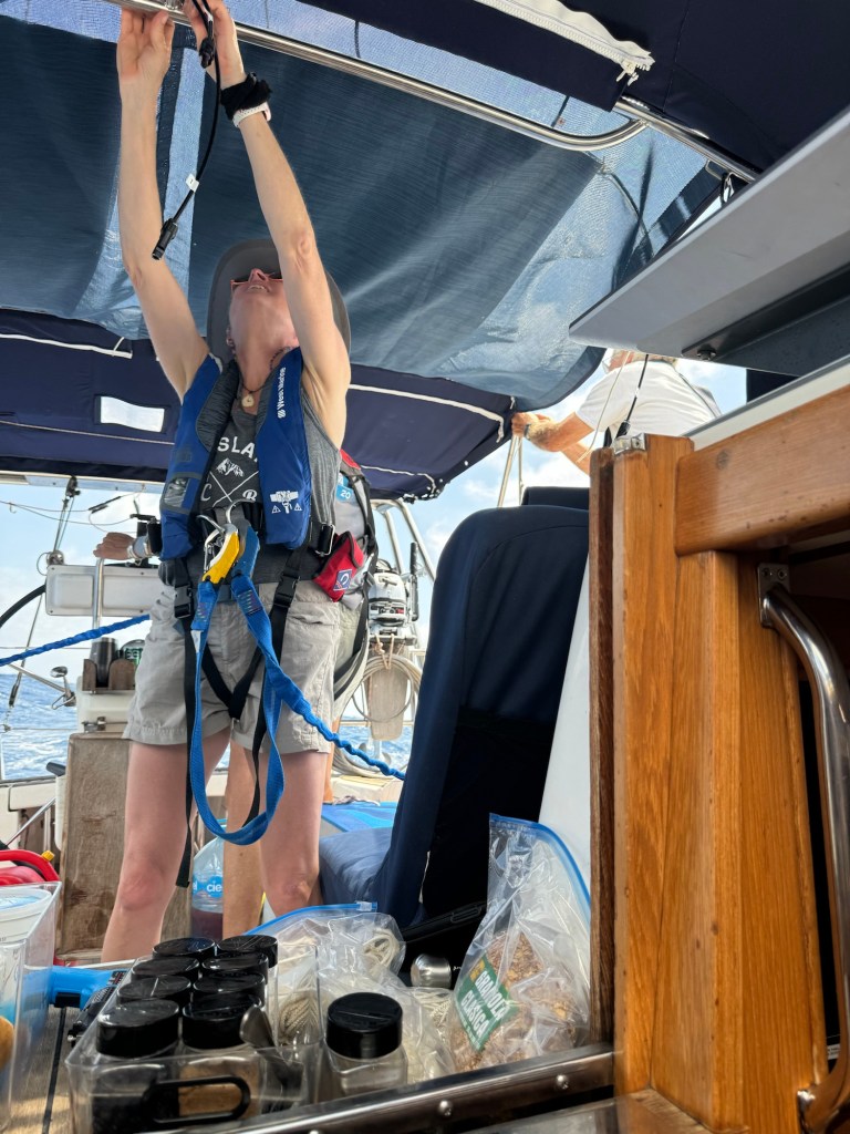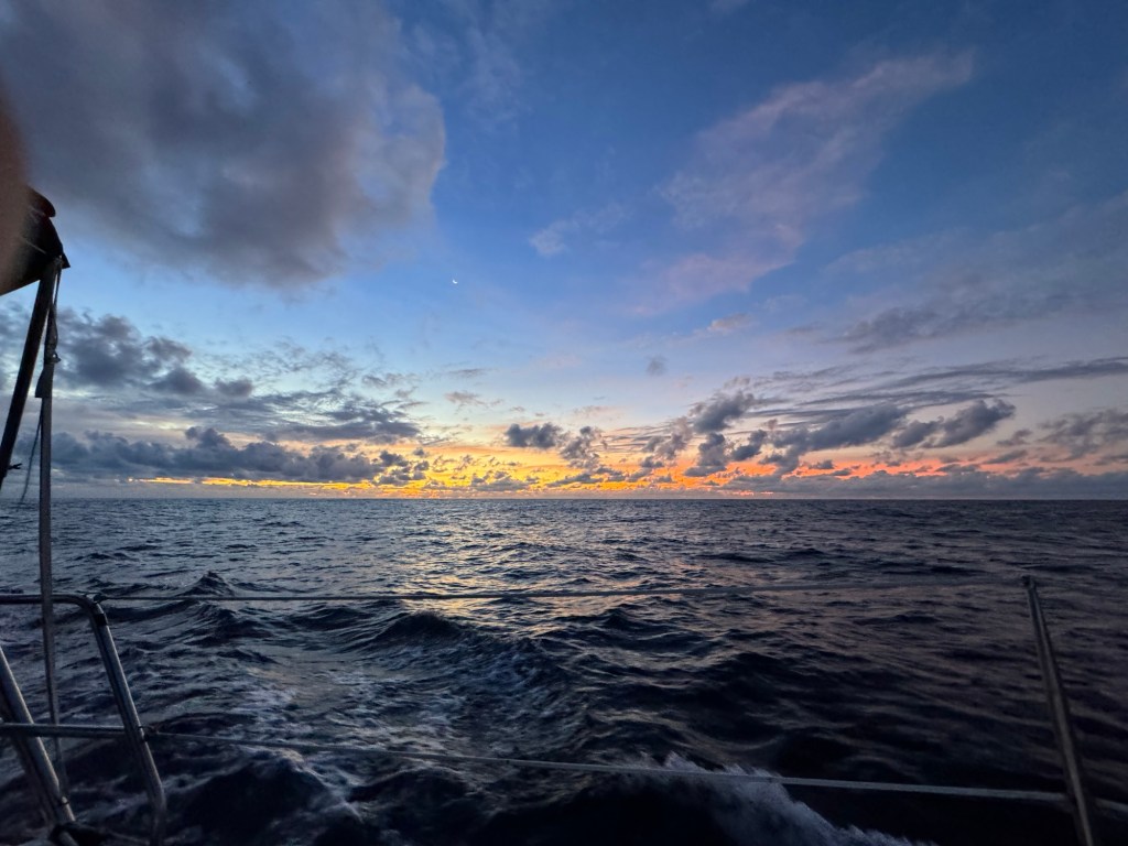 Our wildlife sitings have been limited to tons of flying fish and some birds. Last night, we had a bird resting on the top of the mast, which must be much more comfortable without the bothersome wind indicator they knocked off. The airhorn and strobe light didn’t seem to bother the bird either. We’re just hopeful the wind anometer stays in place.