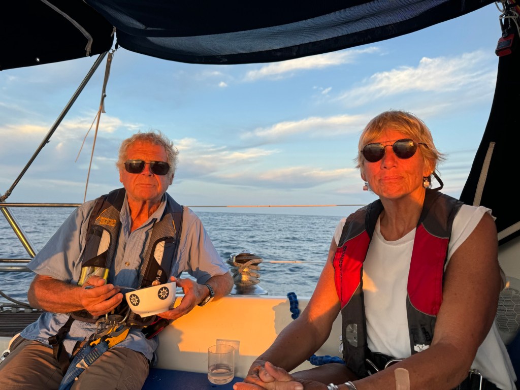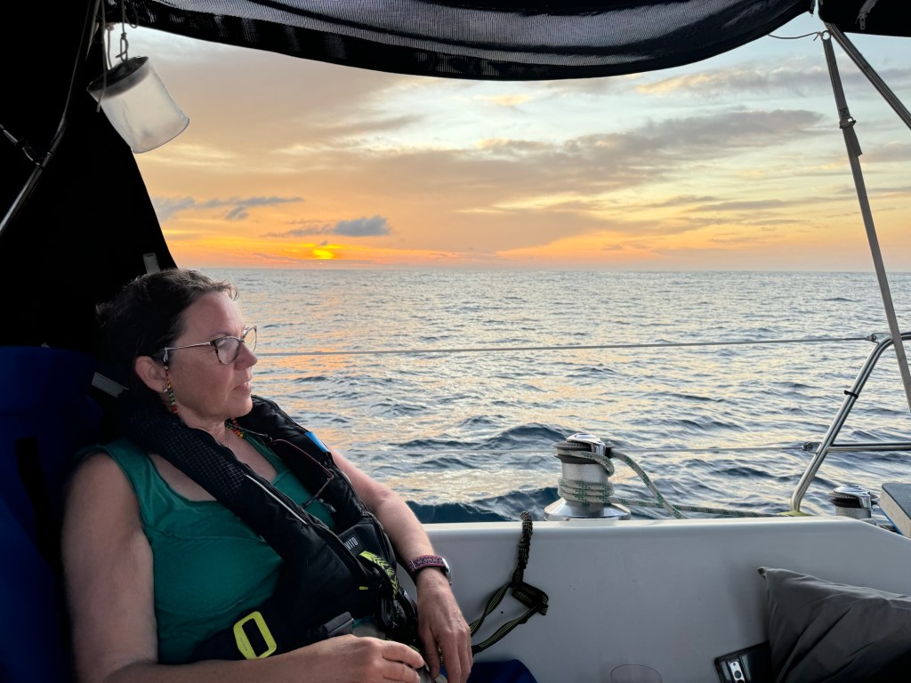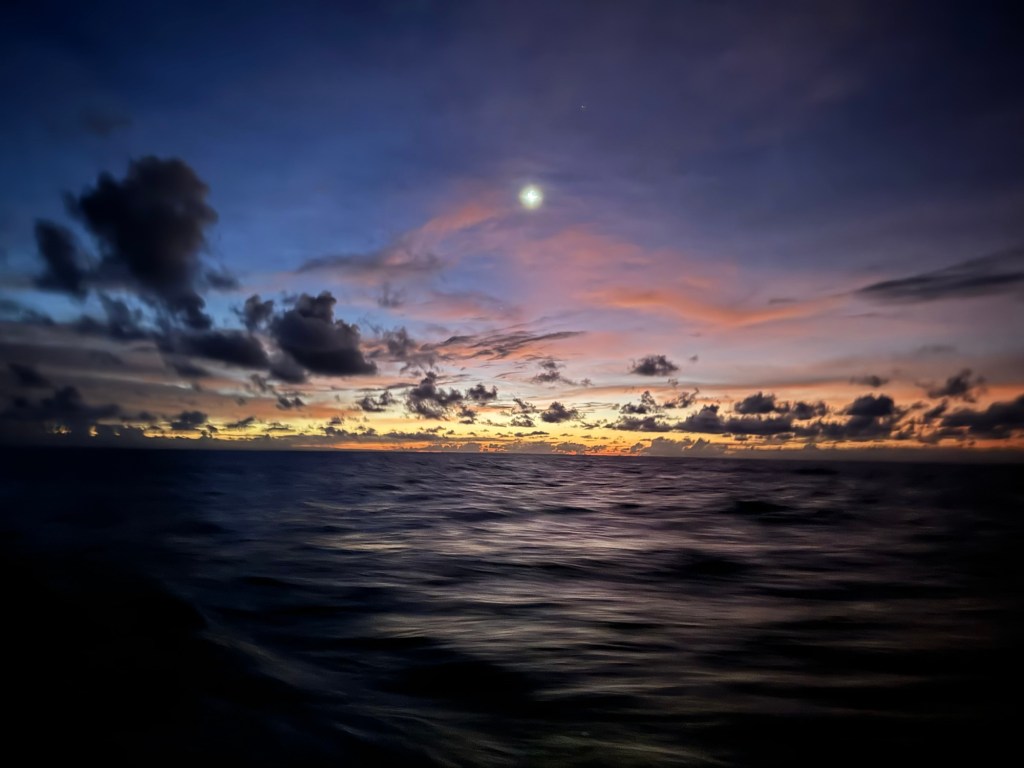 The days pass quickly as we all have different watch and sleep schedules. We spend most of our time in the shade of the cockpit chatting or reading. Most evenings we have one cocktail and enjoy dinner together while we watch the sunset. One morning in the ITCZ, our sunrise lasted almost an hour.