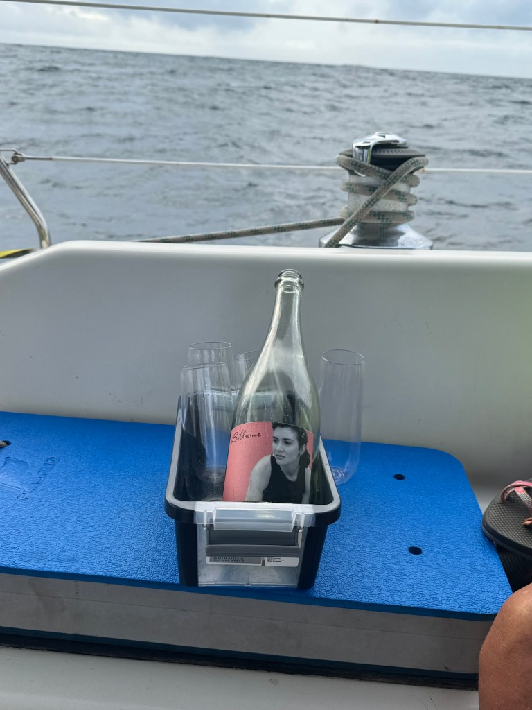 Today we crossed the equator and became official shellbacks!!! We are fifteen days into our journey and probably have six or seven days and fewer than 1,000 miles left to go. Thus far we’ve been lucky with the weather and winds. We’d saved a bottle of Mellisoni Bollicine sparkling wine, which was a delightful way to celebrate at 7:30 AM! Of course, we also toasted Poseidon and shared a sip with him.