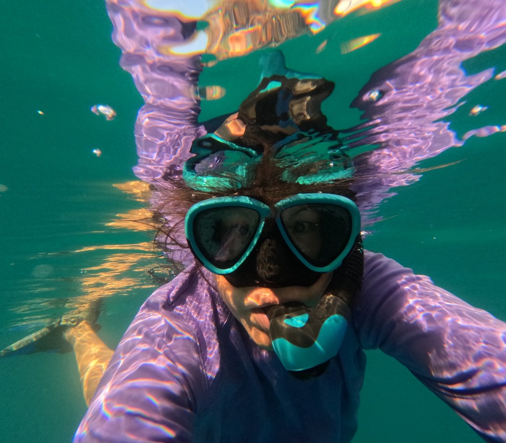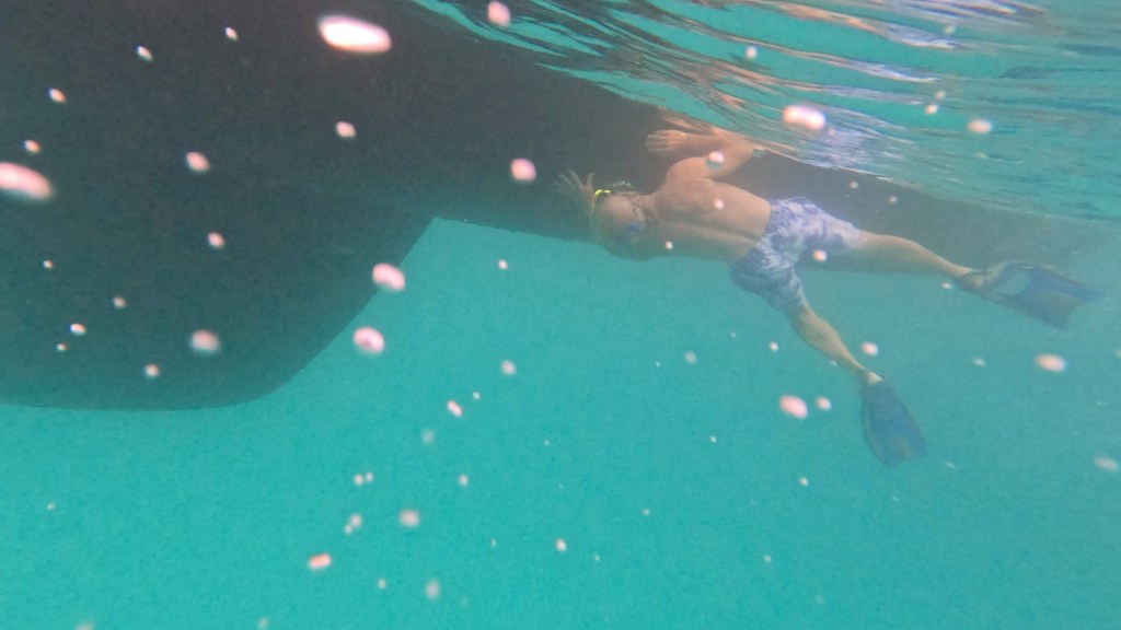 Later that afternoon, I swam around the bay using a snorkel, mask and fins. I don’t call it snorkeling, because I kept a cardio-invigorating pace, while still enjoying the view of the fish swimming below. And then I saw a turtle! Just in case you’re wondering, turtles swim faster than you think they would given their small flippers. I swam above the turtle for a few minutes, then it turned and quickly outstripped me.