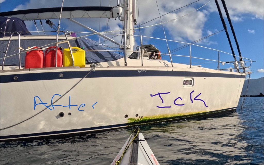 Lest it seems all fun, Herman scrubbed the waterline of the boat, which was covered with gunk from LaCruz, our crossing and Hiva Oa. We also figured out one of the problems with the freezer was that both the intake and exhaust hose were completely plugged with mussels and other sea life. I tried to figure out the GoPro while defrosting the fridge.