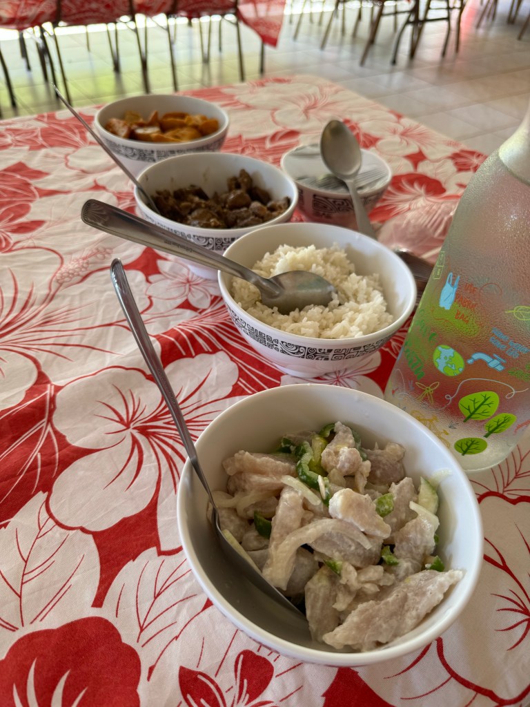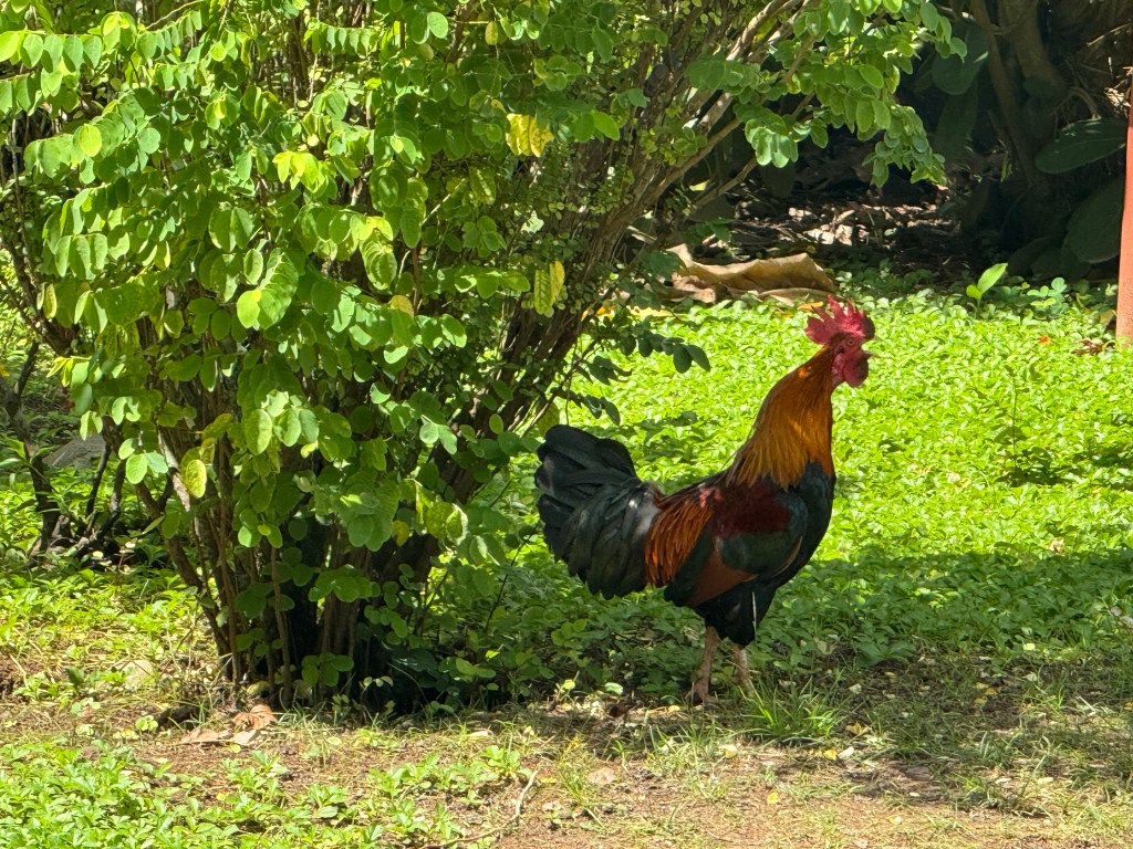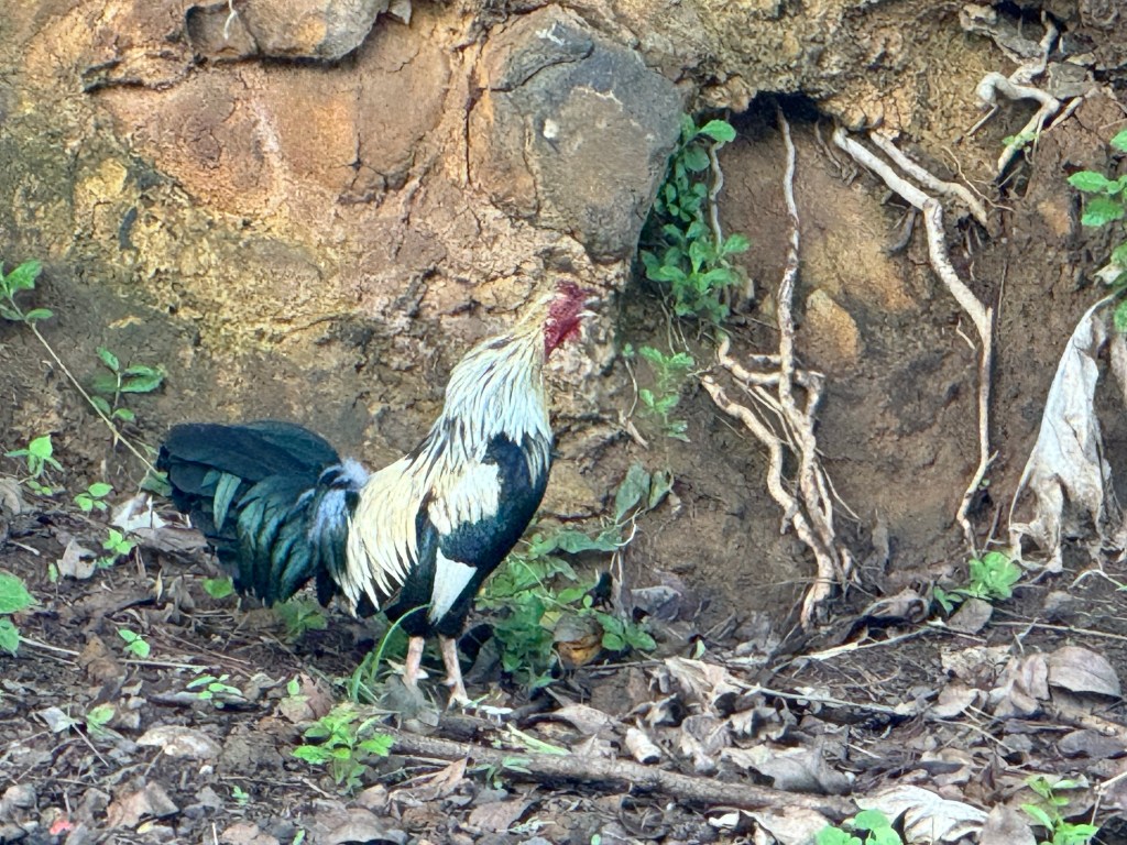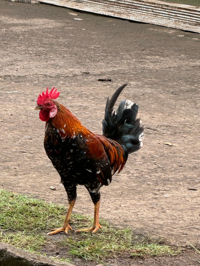 The feathers than adorned the costumes come from the bankiva fowl known as the caveman predecessor to our modern chickens. They’re all over the island and their iridescent feathers are just stunningly gorgeous. One of the beauties of bike rides to Atunoa was going slowly enough to see wildlife without disrupting them too much.