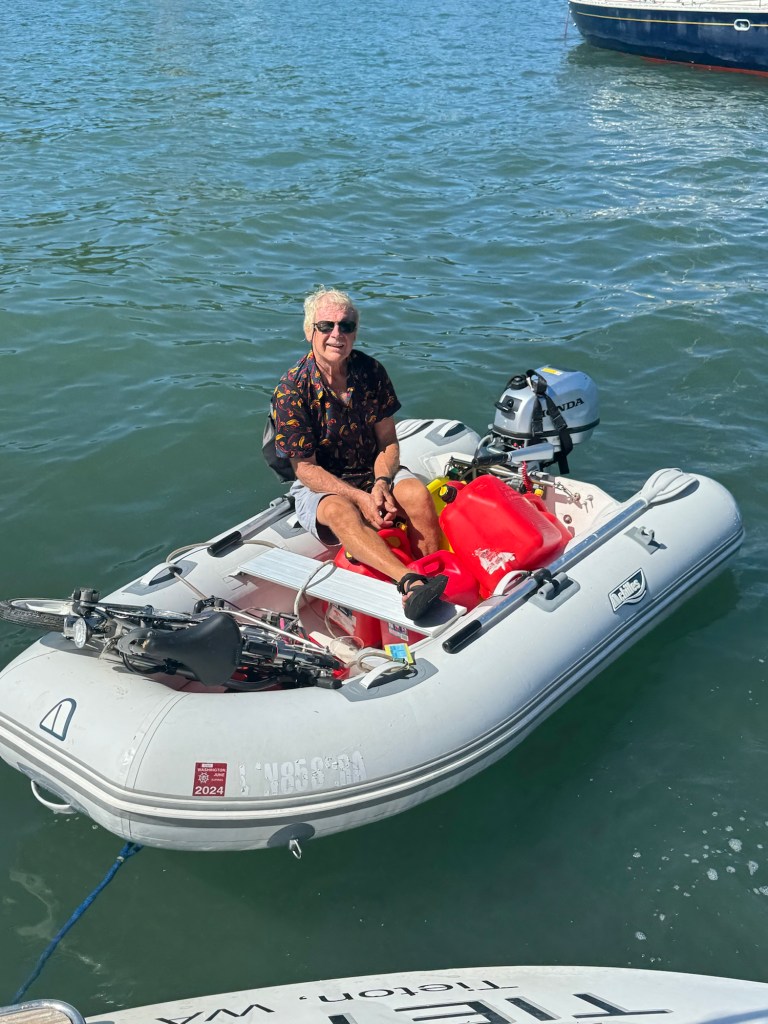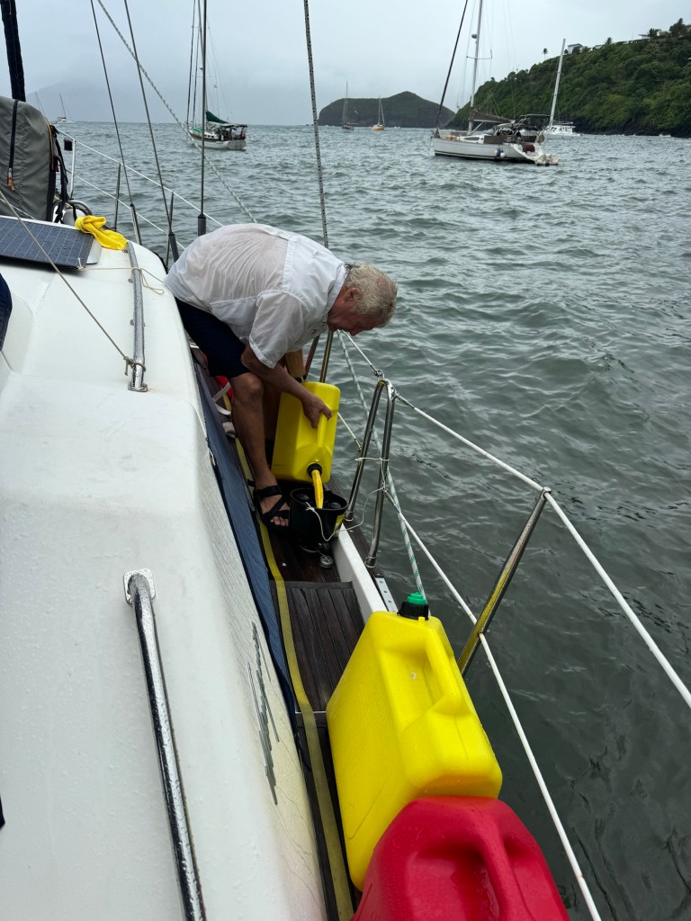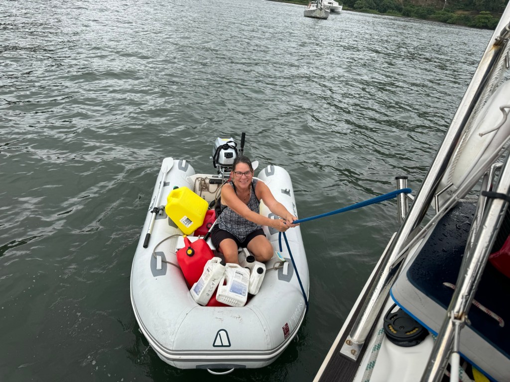 Fresh fruits and vegetables, diesel and gas were our reprovisioning priorities. We arrived to Hiva Oa on Friday, which preceded the three day Pentecost holiday weekend, so the gas station and government offices were closed until Tuesday. On Wednesday, we received our visitors’ diesel fuel tax exemption, which saves about a third of the cost of diesel. Then the fun began… the gas station is about a block from the dock, which meant we loaded our six five-gallon containers into the dinghy, motored to the dock, walked to the station, filled the jugs, lugged the full containers back to the dock, transferred the containers to the dinghy, returned to the boat, lifted the full containers onto the deck, then poured the fuel into the tanks. This harbor has the well-deserved reputation for being rolly, so that added more effort. It took FOUR trips to fill our tanks, plus another for gas for the generator, which took us into Thursday since the gas station (the only one on the island) closes at 3 PM. On one trip, when we moved the dinghy to retrieve the containers, three beefy Marquesas natives brought our containers to us, with nice smiles on their faces 🙂