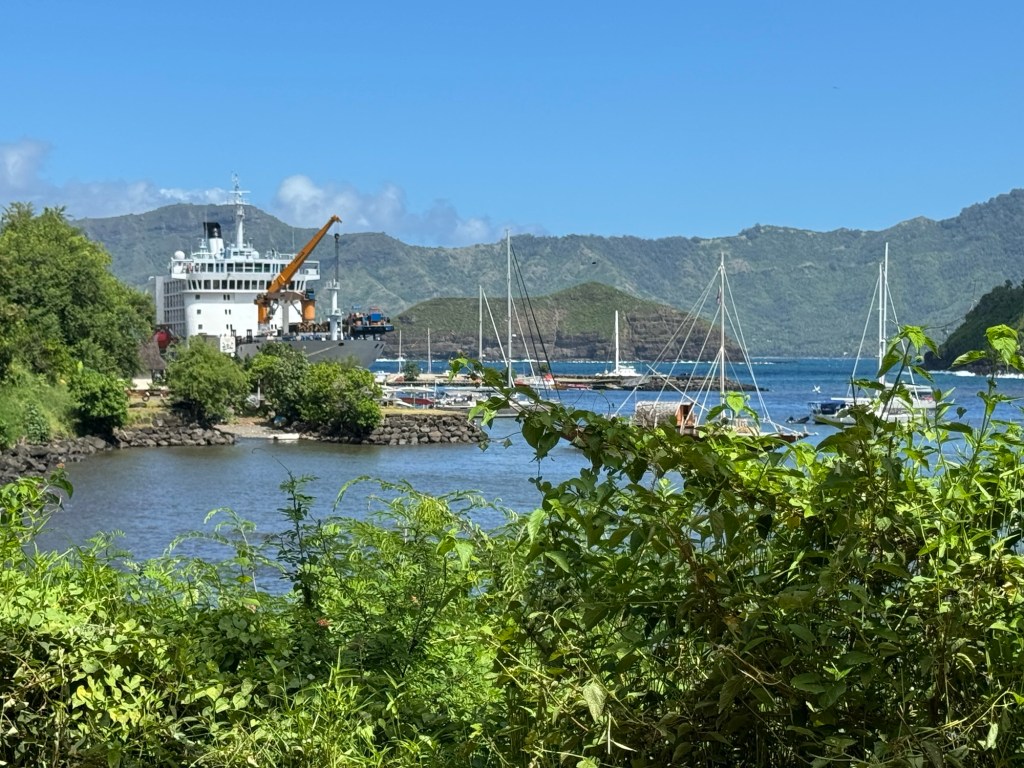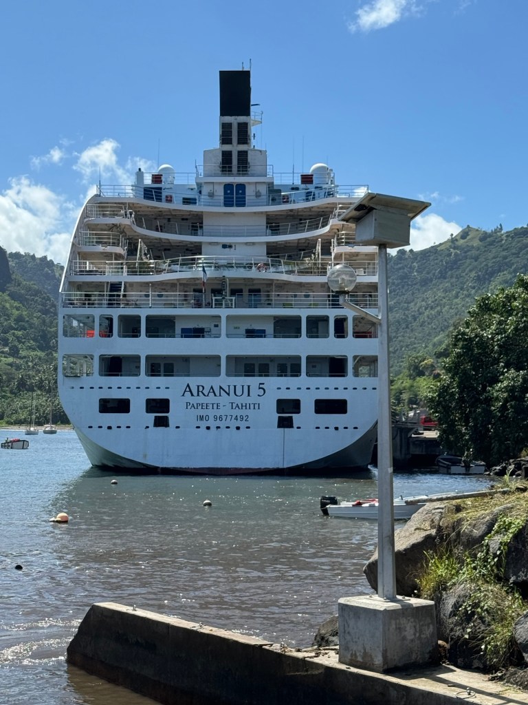Grocery shopping was another adventure, especially since we’re now speaking (or not) in French. Thank goodness for “the cruisers’ shopping list”, Google translate, friendly people and sign language. The small grocery stores in the three-block town of Atuona receive most product via supply ships every couple of weeks. The cruise/freighter ship Arunai 5 might be a fun way to see this part of the world! It was amazing to see the ship pull into the relatively small harbor and dock.