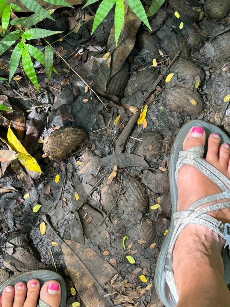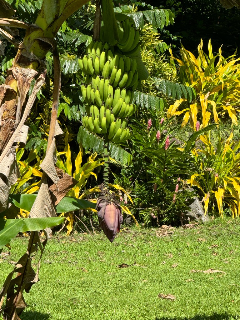 We continued along the mostly paved two lane road, which occasionally transitioned to a single paved or dirt road. Fortunately Herman toned down his inner race car driver. We’d made reservations at Restaurant Marie Antonette for a lunch of native cuisine that included goat, pork, and fish marinated in lime and coconut milk. Of the four desserts, my favorite bananas ou citrouilles ou ccours de coco (baked banana with coconut milk), which I plan to make sometime, because we loved it!