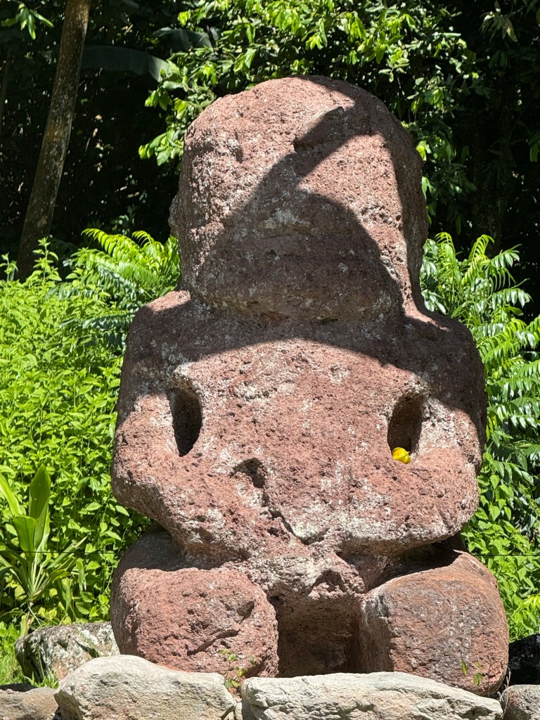 To get to Tiki Souriant, we were told to look for a dirt pullout under a mango tree, which was amazingly accurate. Fortunately a small sign on the tree also helped. We wandered down the nearby dirt road and ran into another couple who told us to take a right at the unmarked Y. The mango-lined path narrowed and brought us to Tiki Souriant, who is purportedly smiling because she’s expecting a child.