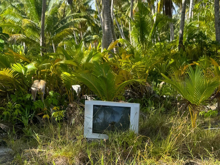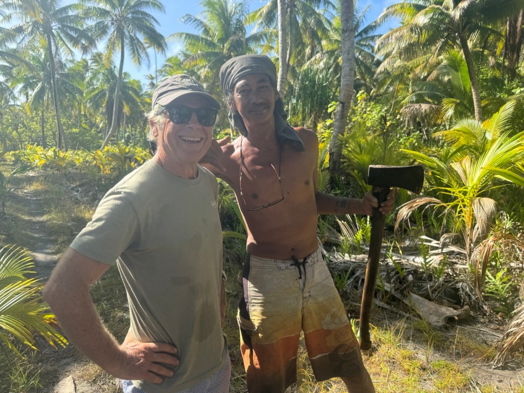The following day Herman and I took the dinghy to the beach for a walk, and we ended up joining fellow cruisers Owen and Tara. We walked along the rutted road that runs the length of the atoll. Several abandoned homes were evidence of more population in the past. We encountered Pierre, a local who was setting out halved coconuts to trap coconut crabs, and seemed delighted to see us. Through a combination of French, English and sign language, Pierre explained that he hangs the coconut in a bush so the crab must eat there, rather than carrying it away. The baby crabs start in the evening and to catch big crabs, Pierre returns at 2 or 3 AM.