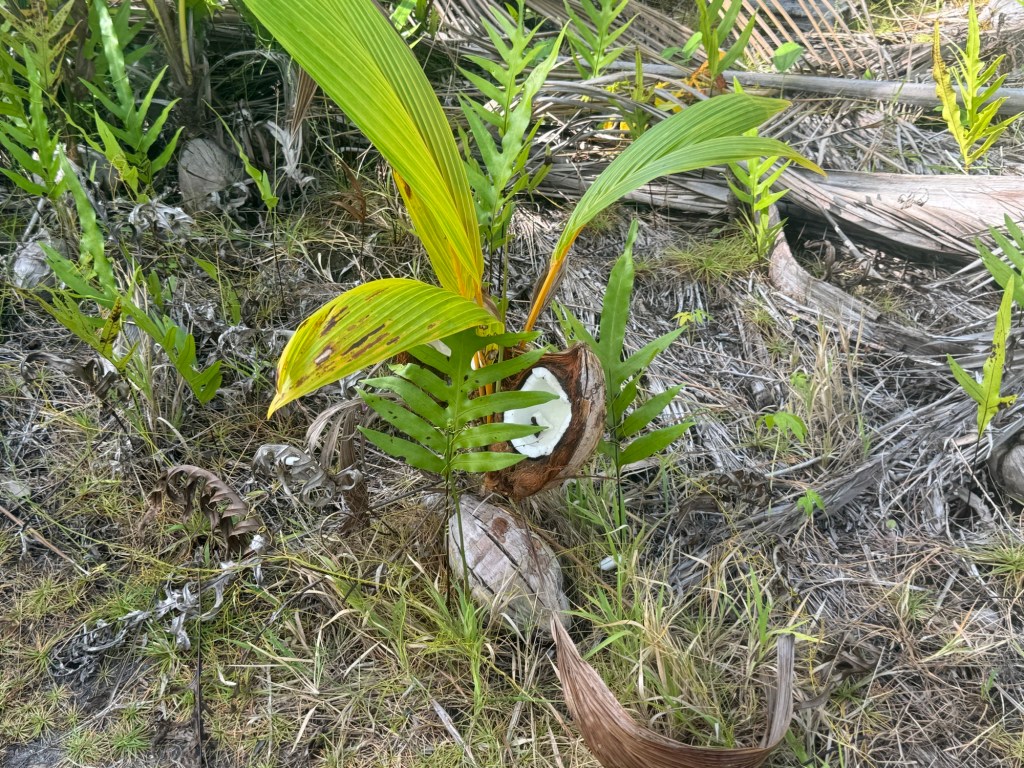 Next, Pierre plucked a coconut sprout and showed us that it tasted of hearts of palm. If we had known how delicious coconut sprouts were, we could have been having them on our salads for the last four months – with landowner’s permission, of course. Pierre enthusiastically offered to cut down a young coconut tree for the heart, which we politely declined.