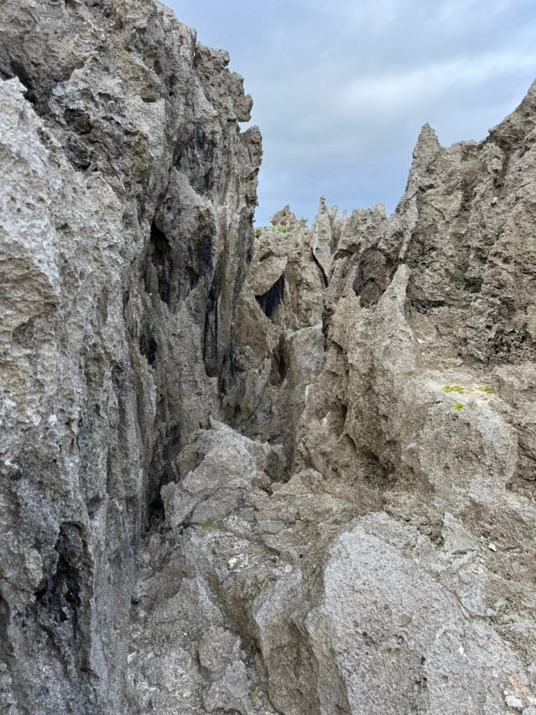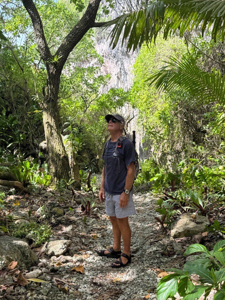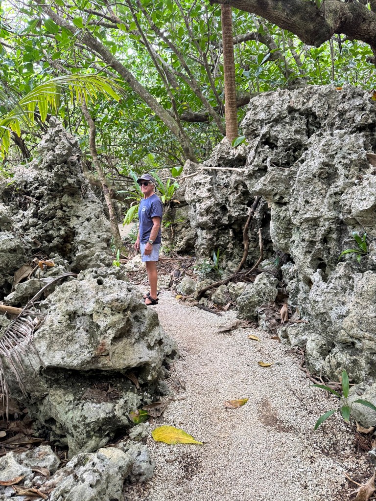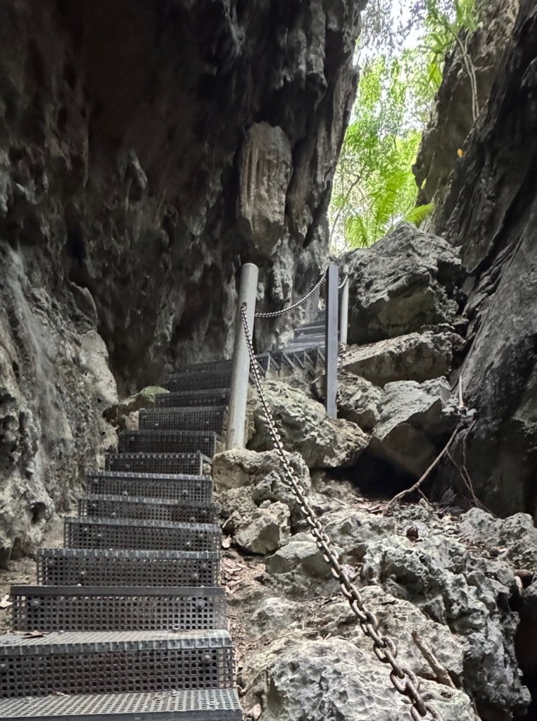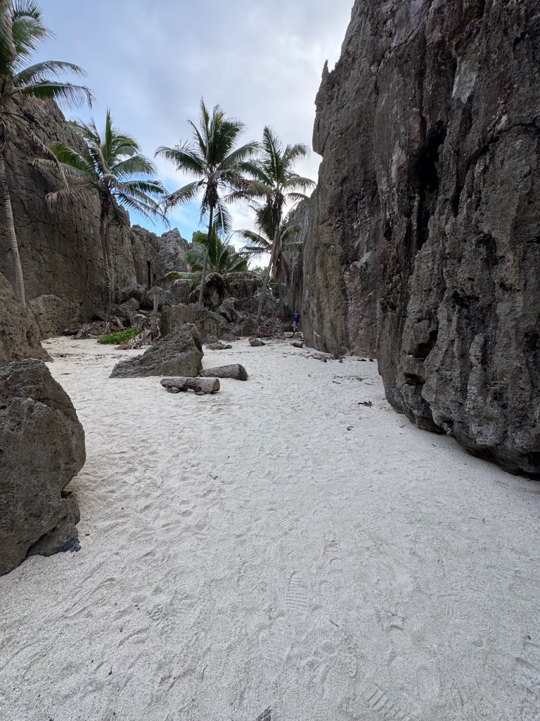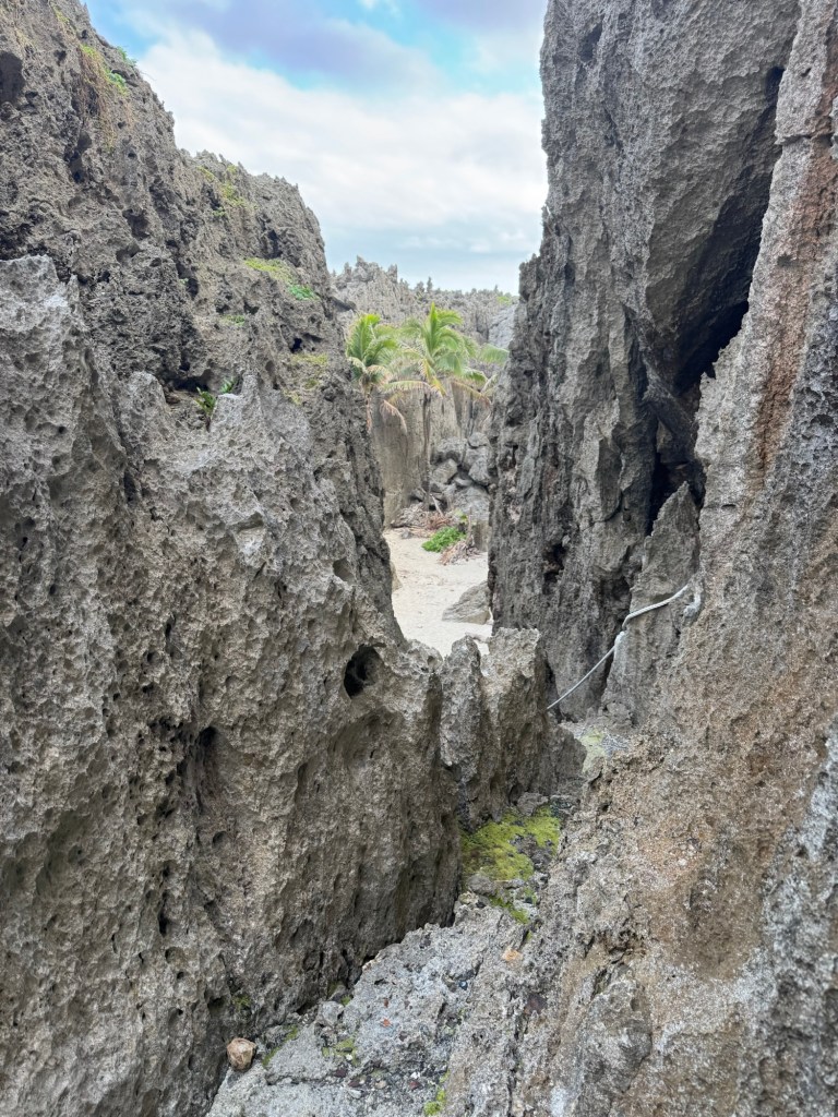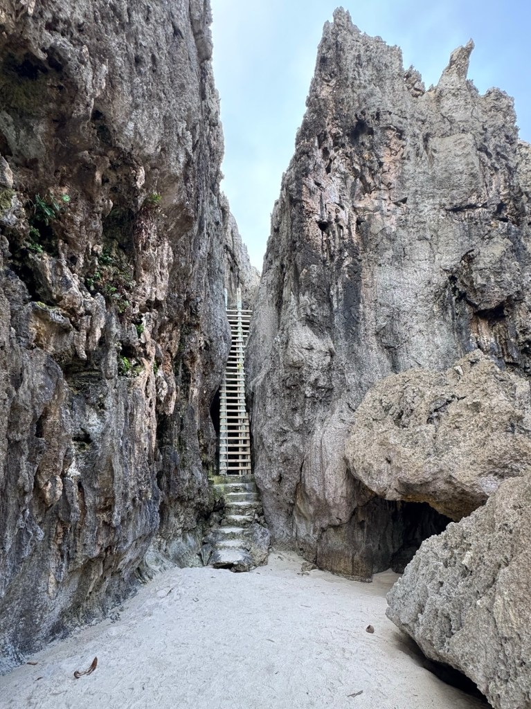 A half hour hike and through a forest and scramble across bare coral, sometimes with rope assists, brought us to Togo Chasm. The sand covered oasis, complete with coconut palms, sits at the bottom of a cliffside ladder. We could hear the ocean through an array of rocks and decided it was best not to chance climbing through lest we encounter the ocean waves bringing in more sand.