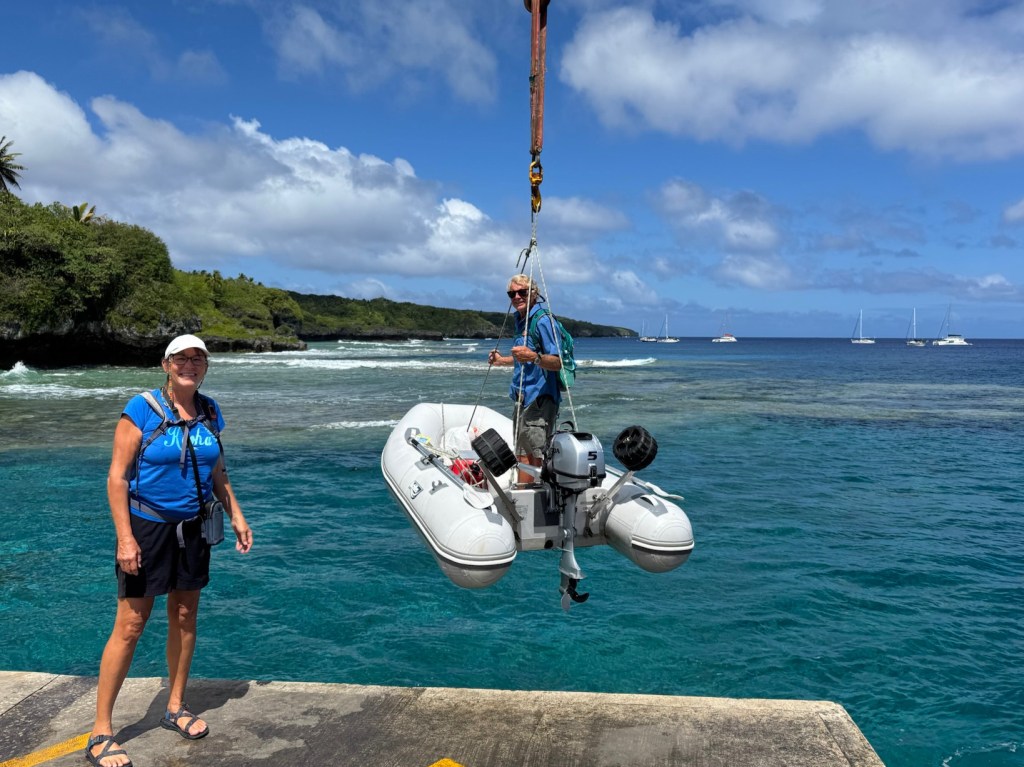 Customs invited us to check in onshore, which we completely understand given the boat/dinghy dock. The wharf was busy with the barge transferring containers from the supply ship to the wharf. Just writing this makes me hold my breath again… Herman approached the wharf trying to steady the dinghy in the surging waves to allow me to grab the ladder and ascend to the dock. (Did I mention vertigo and a fear of heights?) Herman then attached the crane hook to the dinghy bridle, and using the dockside crane, I lifted the dinghy and maneuvered the dinghy to the dock. We wheeled the dinghy to a marked parking spot, and restored the crane hook to its seaside location for the next user. People on the dock frequently offered their help, which we gladly accepted. It was so much easier, albeit terrifying, to climb into the dinghy and be lowered into the water.