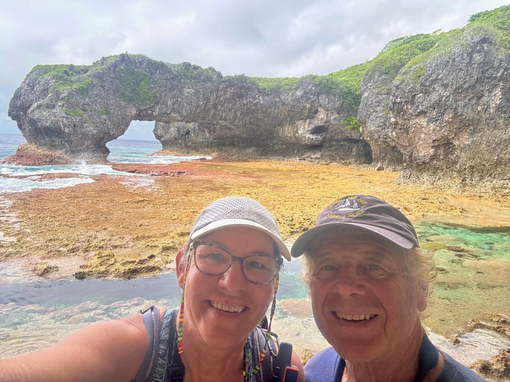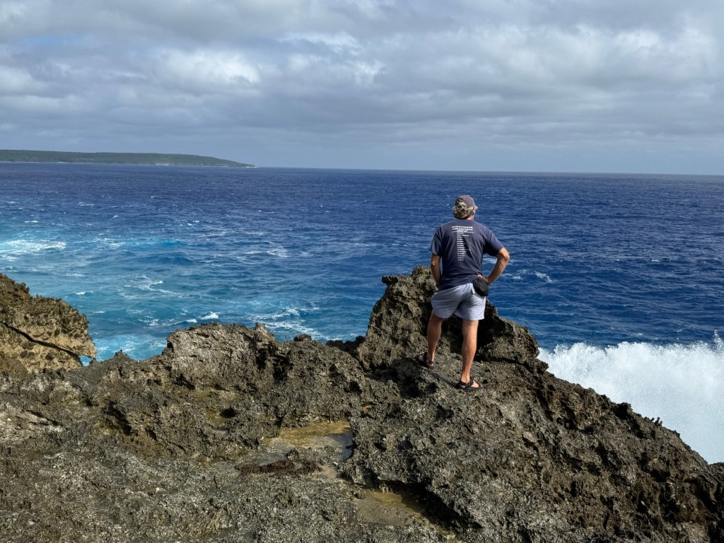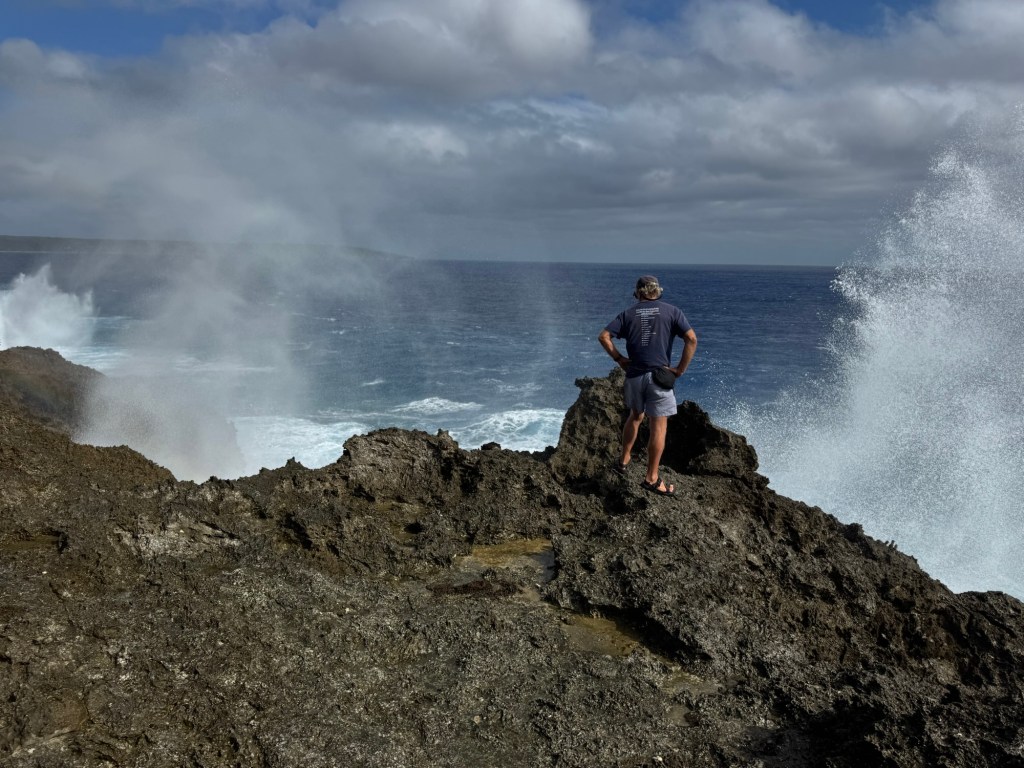 The Ana Ana Point at the southern tip of Niue looks out on the vast expanse of the Pacific Ocean. The powerful surf surges through the blowholes that have been worn over time. Herman was a good sport and got soaked by the spray, and the photographer also got a little wet. We certainly wouldn’t stand on the cliff during any significant wind or waves.
