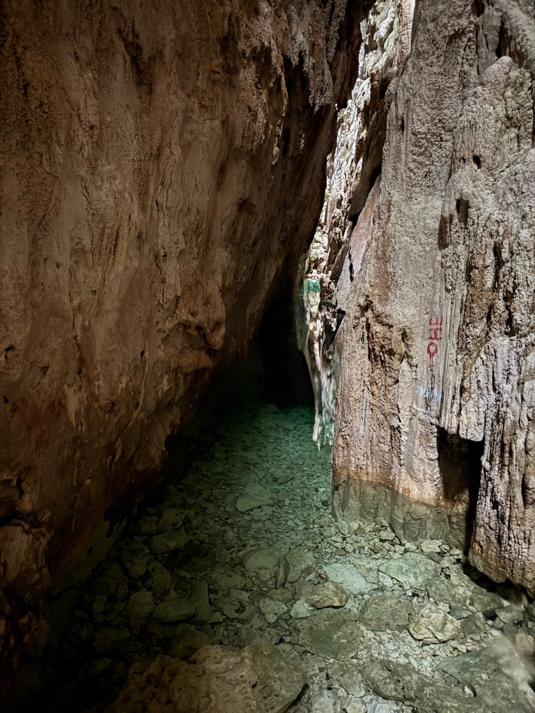 We walked down the path through no the drip stone cave that brought us to the reef-side cave. We timed our visit for low tide so we could snorkel in the beautiful cave.
