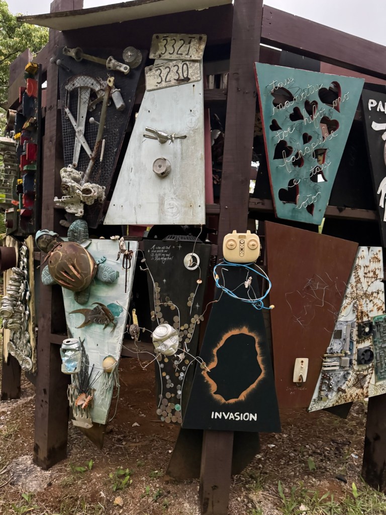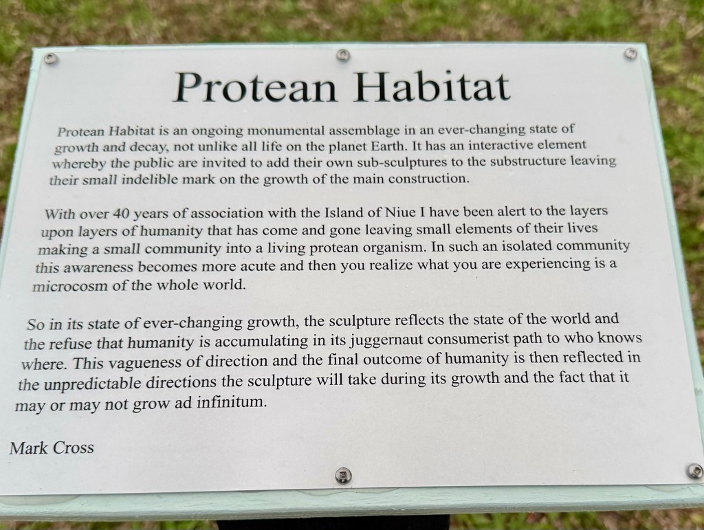 Dusk brought us to the sculpture park, which we thought we’d miss and sure are glad we didn’t. The artist’s Protean Habitat invites the community to contribute their refuse to the ongoing monument that “reflects the state of the world and the refuse that humanity is accumulating in its juggernaut consumerist path…”. Heavy stuff.