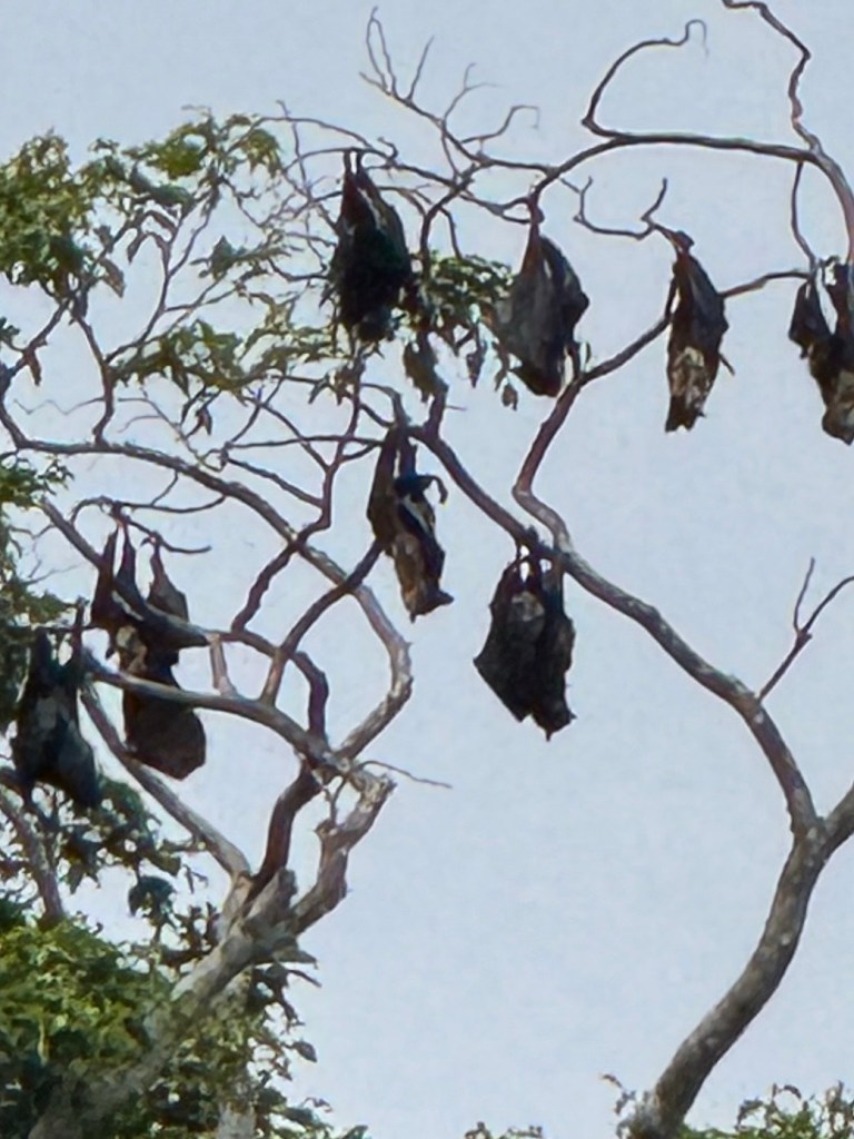 Flying foxes are indigenous to Tonga where they nest in trees, serve as pollinators, and eat fruit. They are endangered due to loss of habitat and use of pesticides. Port Maurelle and Neiafu both had nesting sites and we spent hours watching these fascinating animals. Flying foxes are basically huge fruit bats that can have wingspans of up to a meter. They wrap their brown faces and babies with the wings, then hang upside down from trees. As nocturnal creatures, they leave their nests at night, although some of them stay quite close. Mothers sometimes fly with their babies attached to their chest. A favorite activity was to take an evening beverage out in the dinghy where we could sit near the trees, anchor the dingy, and watch them.