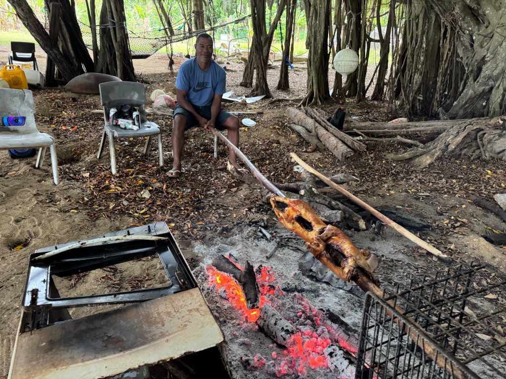 David’s daughter and her family hosted a delicious pig roast for the cruisers, which provides a bit of income for her family. The spread was laid out underneath the banyan tree on the beach. She carefully carved the pig under the watchful eye of her two year old, who occasionally snatched a piece of skin or bone for himself or his one year old sister.
