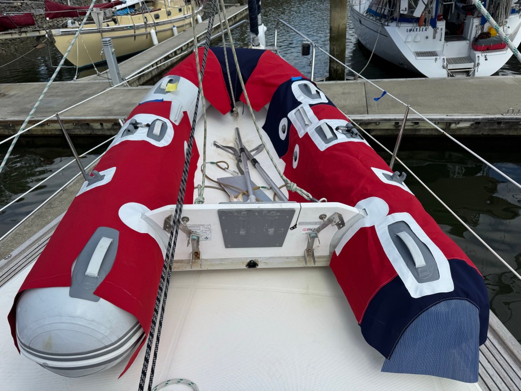 When we return we have a few urgent projects that we weren’t able to schedule when we arrived that have now been scheduled to occur in early March. Our windlass motor is being rebuilt and Herman needs to install it, our generator motor needs to be pulled then rebuilt (parts in Poulsbo) or replaced, and I need to finish our dinghy chaps. Unfortunately, the day before we left Herman discovered why the galley light wasn’t working, which turned out to be a short because of a leak. The leak started when the boom brake attached to the deck caused small cracks in the deck, which leaked through the deck into the wood and created a big problem. The boom brake restrains the boom (at the bottom of the mainsail) from accidentally coming across the boat. It is an essential piece of safety equipment that endures tremendous stress and we’re glad to have discovered the problem at the dock rather than underway! Steve, who was working with our neighbor, walked Herman through what needed to be removed and lent the tool to saw through it. It will have time to dry and air out while we’re away and then we’ll continue the repairs. Last, but not least, I need to finish the dinghy chaps I started – such a beautiful piece of art!