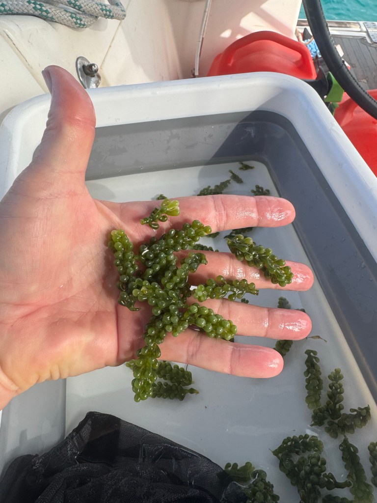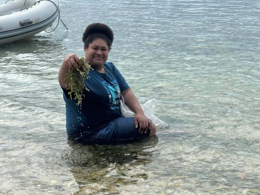 A fairly large group of people gathered at the beach the next day to await the return of local delegates who’d traveled to witness the installation of a new president of the Lau Group. We were told Bill was in the village preparing lobolo, the island’s fish and coconut dish, to be consumed later that day at the village celebration. Later, Bill and Herman took our dinghy to get clams, while Amelia and I harvested nama (grape seaweed). Amelia showed me how to pull the seaweed, and we did a preliminary wash at the beach. Later she would pluck the grape clusters from the vines, complete the cleaning, rinse in fresh water, and then do a final rinse with hot water.