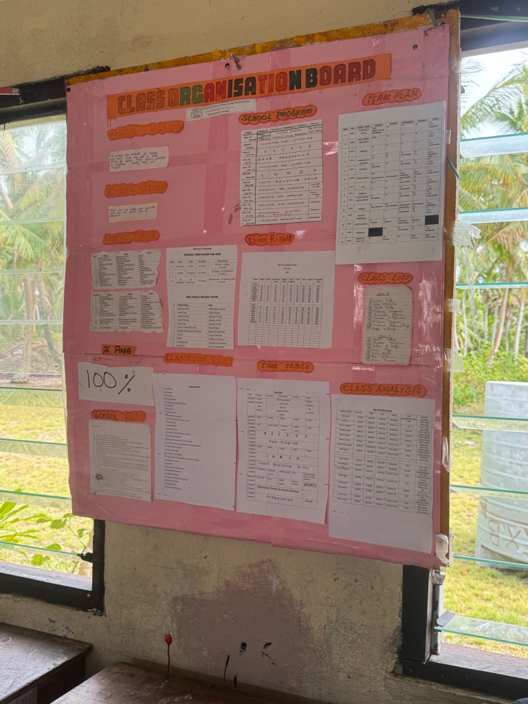 The island’s primary school educates students from Kindergarten to eighth grade. Children from the two outlying villages are housed in the school dormitory from Monday – Friday. Teachers have multi year contracts and are provided housing within the school compound. The breadth of material covered in one classroom was remarkable: Alphabet, morals, division, sentence structure, and plant parts. In addition to recess and lunch, teeth brushing drills were scheduled immediately after lunch. Students’ grades were posted on the bulletin board for anyone to see. Let’s just say, expectations are a little different.