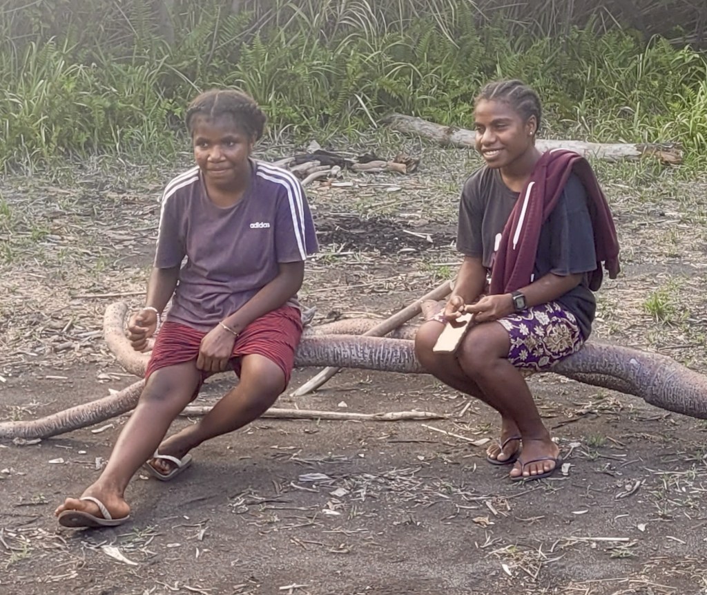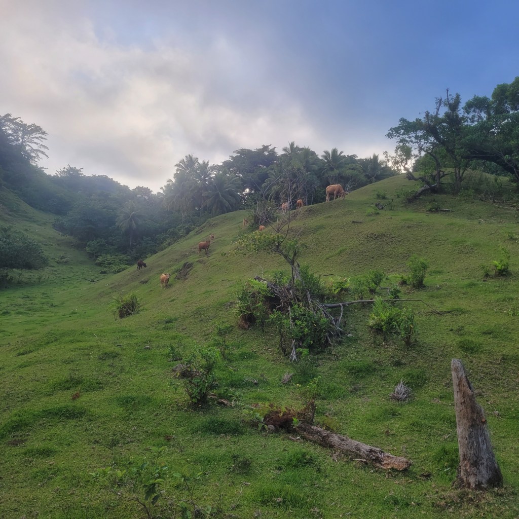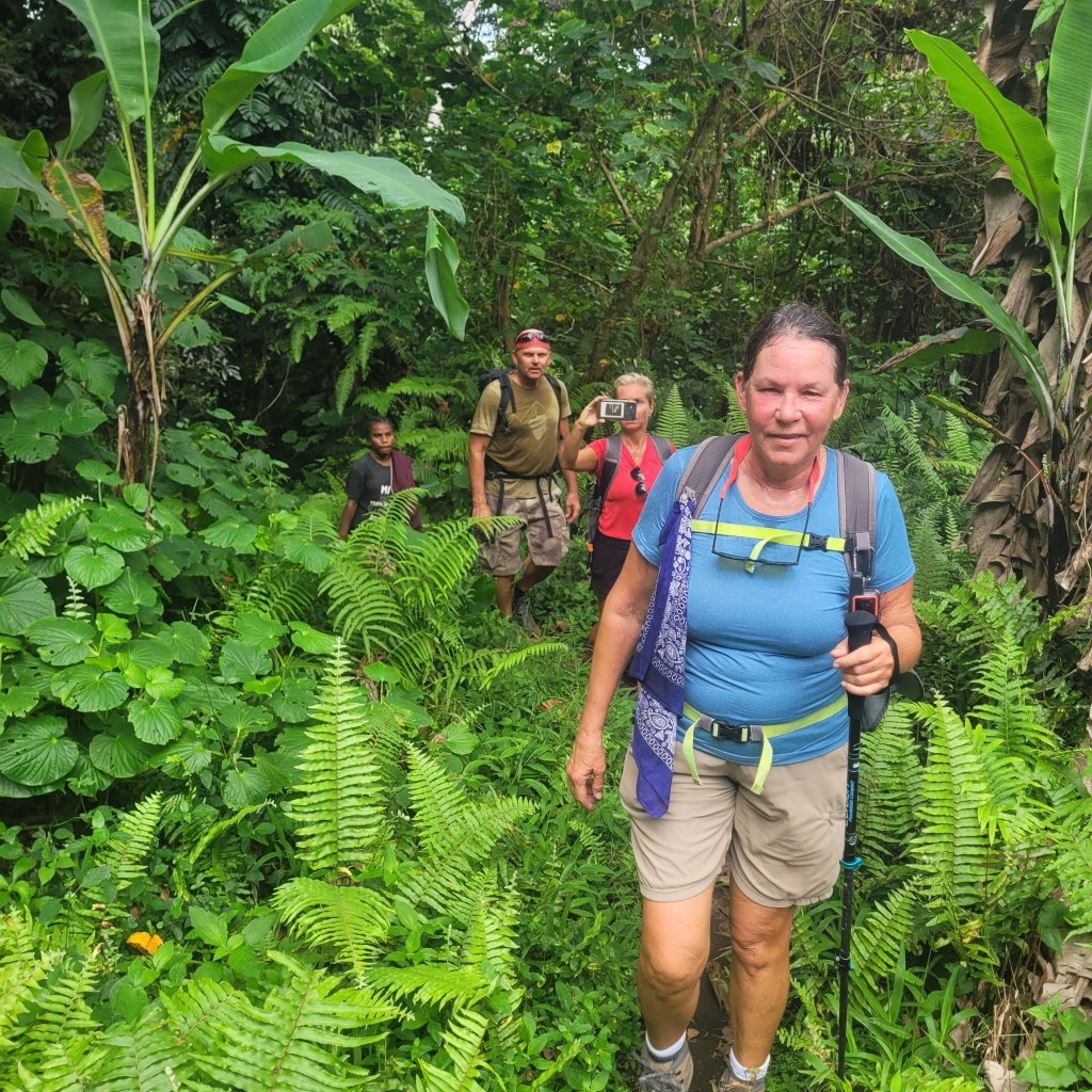 We met our guides, teenagers Evelyn and Susan, at the shore and they walked with us to their village. The villagers raise pigs and cattle, which are sometimes butchered and sold. Pigs wandered through the village along with us. We were offered fresh coconut and enjoyed the coconut water followed by the meat. And then… we started the ascent. Some of the photos remind me of the heat and humidity – notice the smoky look, red faces, and sweat.
