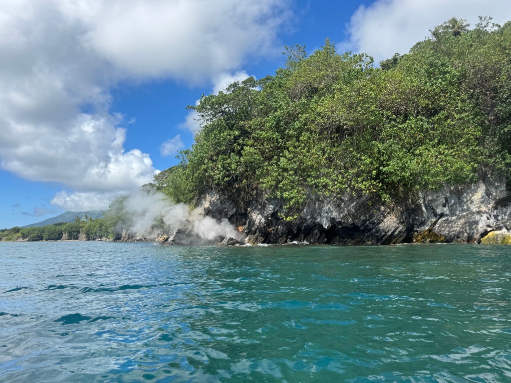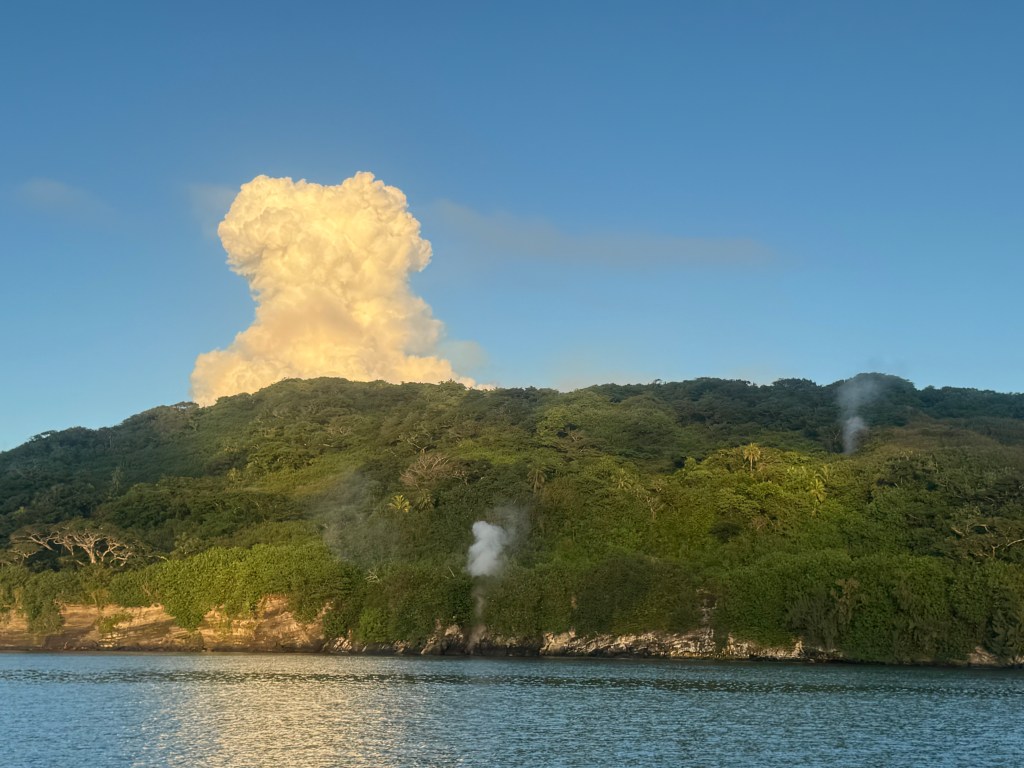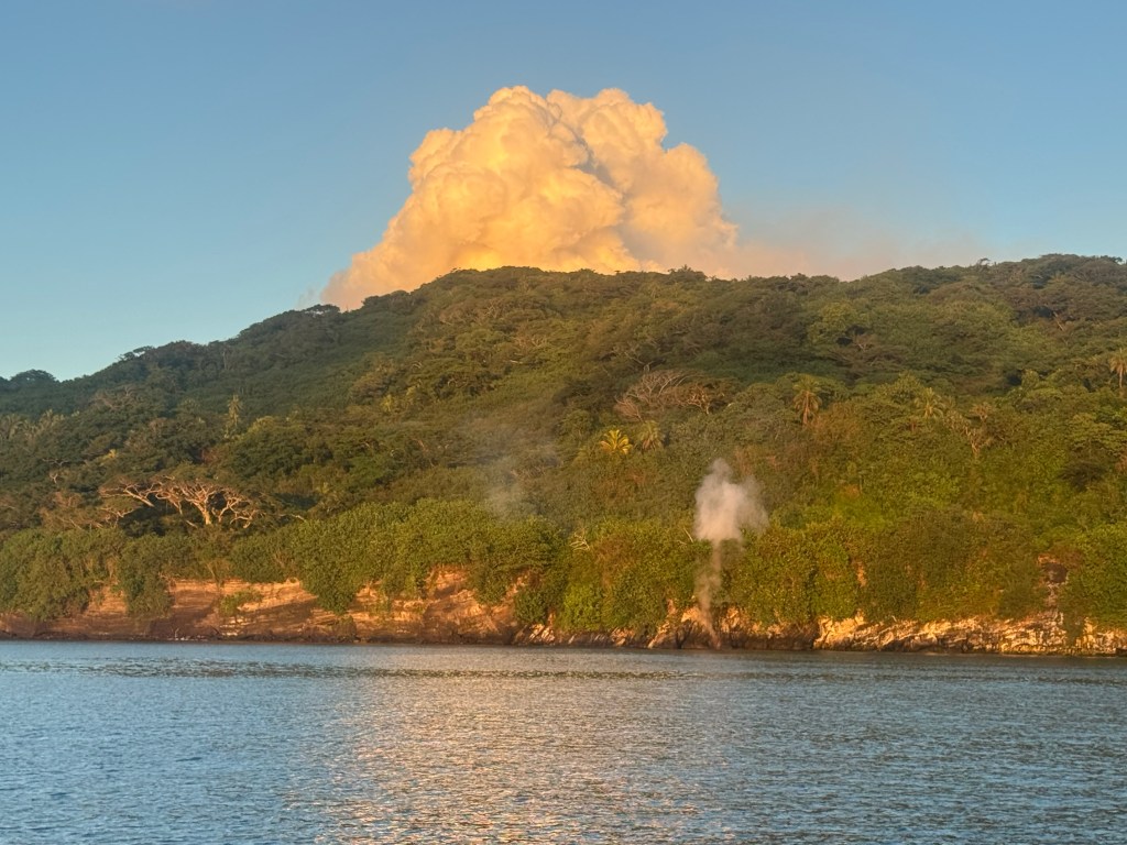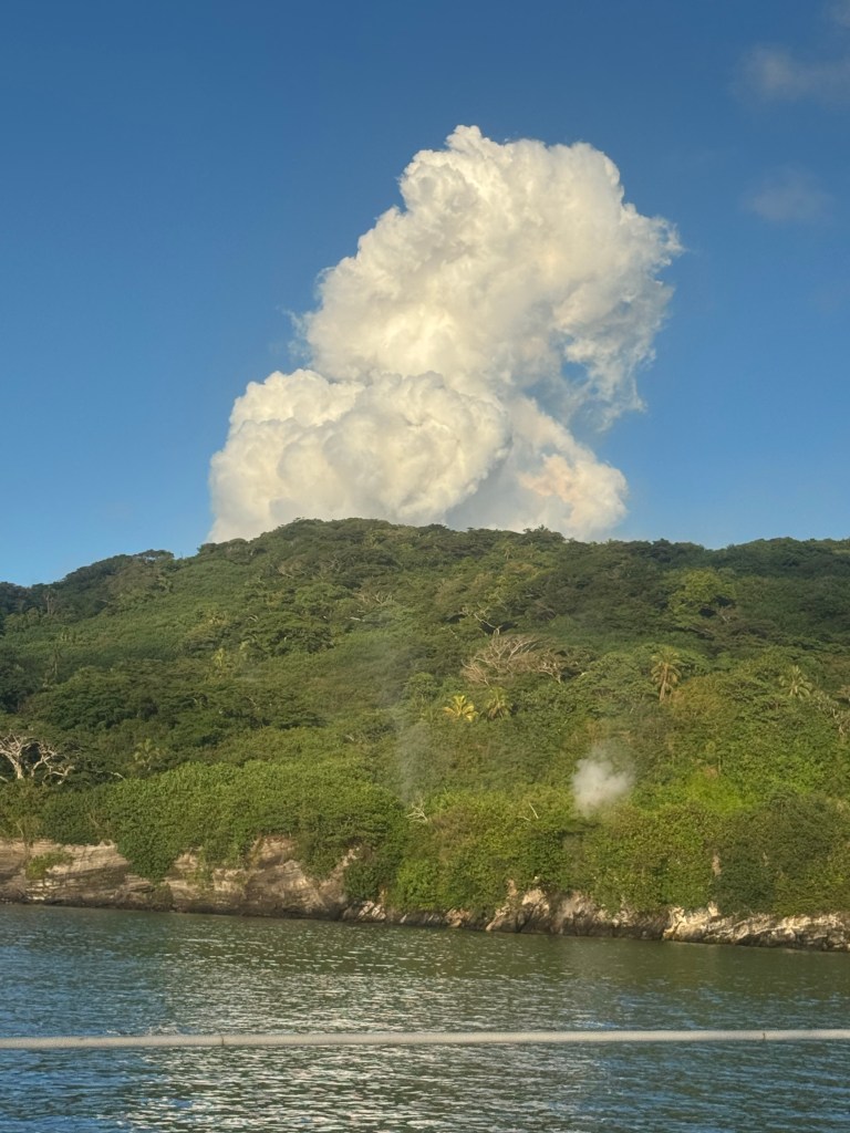 We anchored in Port Resolution where we had a view of the steam and ash spewing from the volcano. Natural vents on the hill intermittently released steam and sometimes boiling water, and a bayside stream spilled boiling water over the rocks into the bay. At low tide near the end of the beach, pools of boiling water can be used to cook green bananas or yams, plus as a local showed some cruisers, scald a freshly butchered piglet to remove its hair. The piglet was later roasted for a potluck 🙂 We spent hours watching the mountain, plus kayaked and took dinghy rides to get a closeup views.
